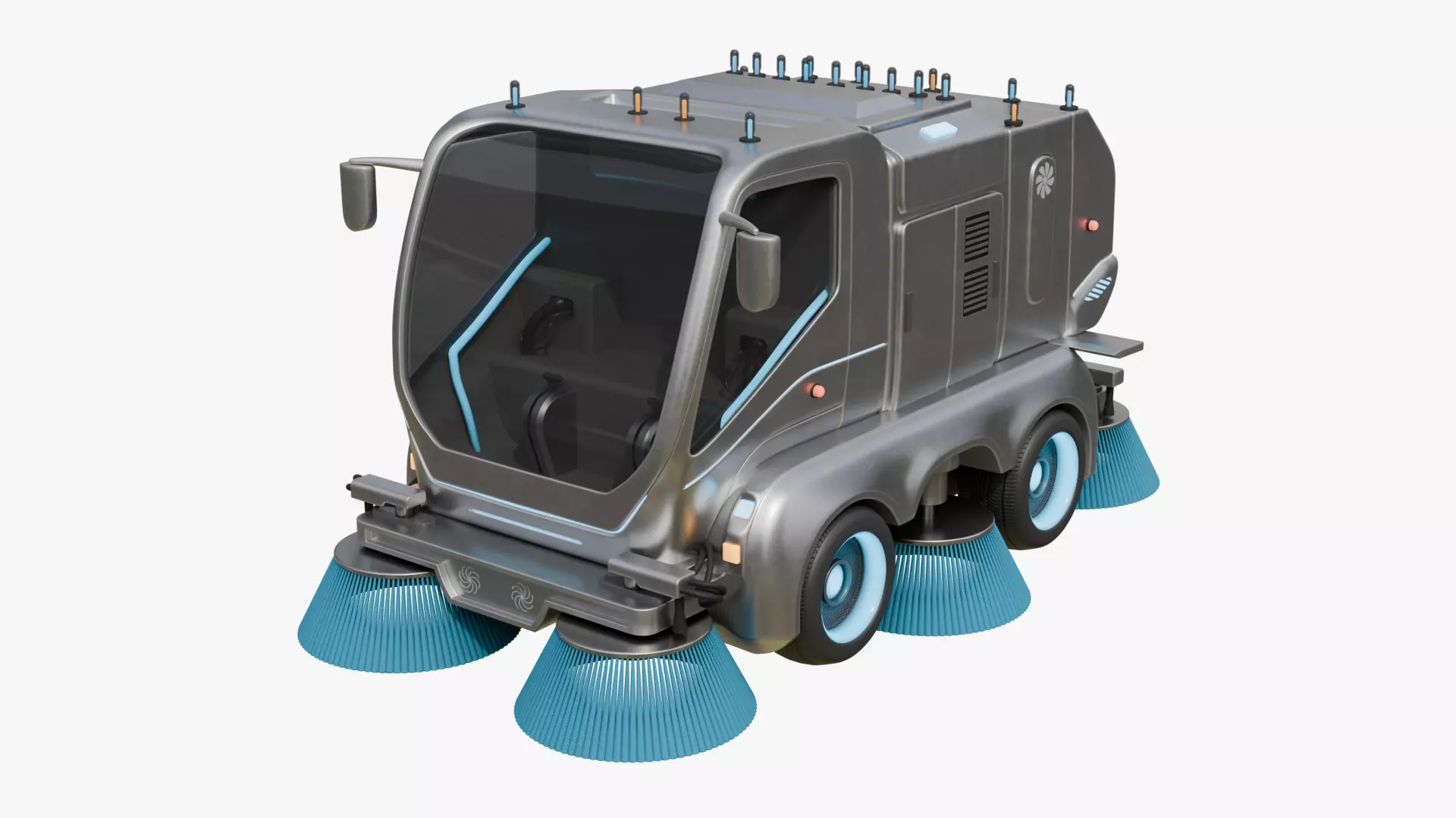 In architectural renders, the model helps communicate a vision of intelligent, well-maintained urban life. It adds realism and environmental storytelling by suggesting automated public services and advanced municipal technology. The glowing tire accents, transparent brush elements, and sleek metallic finish make it visually distinctive without overpowering the scene.