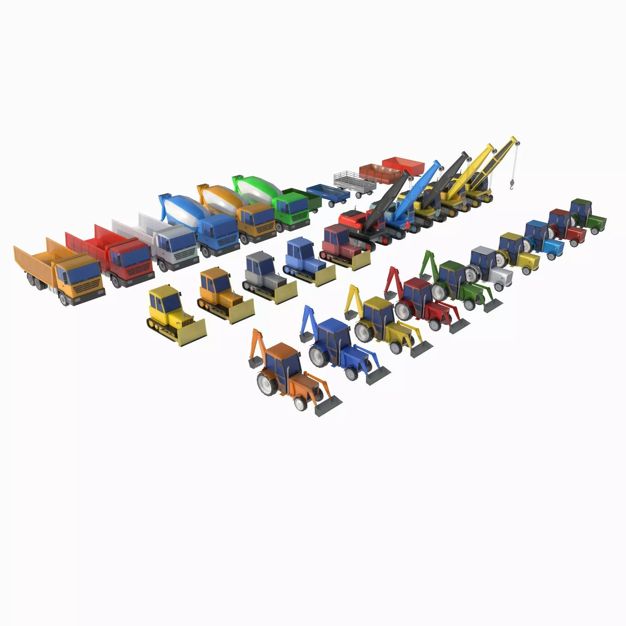 3D models of heavy equipment, excavators, tractors, bulldozers, cranes and dump trucks with mixers.The collection contains 11 unique models and 31 varieties and color variations of models.Each model has from 1500 to4500 polygons, in total the set has 87241 polygons. Models were made in Cinema 4D 2023, converted to 3DS Max, Blender, Unity, Unreal Engine and other formats. Texture palette – png 128x128.