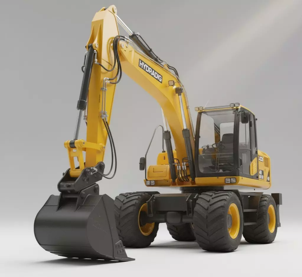 This project delivers a meticulously crafted, high-fidelity 3D model of a modern wheeled excavator, designed for professional applications requiring exceptional detail and realism. The model faithfully replicates the distinct bright yellow bodywork, accented with authentic black and silver hydraulic components. Every element, from the robust, treaded tires with their characteristic yellow hubs to the intricate network of hydraulic hoses and pistons on the articulated arm, has been precisely engineered.The cabin features transparent glass, revealing a detailed interior complete with a driver's seat and control console, enhancing the model's immersion. Branding such as HYDRADIG on the main boom and the JCB logo prominently displayed on the rear counterweight, alongside the JCB 40 MM110 40 text on the side panel, are accurately reproduced with correct typography and placement. The heavy-duty black digging bucket, positioned at the front, exhibits realistic wear and material texture. All safety markings, lights, and mirrors are included, ensuring a complete and accurate representation of a working excavator. This model is ideal for simulations, visualizations, product showcases, and digital asset libraries where unparalleled precision is paramount.