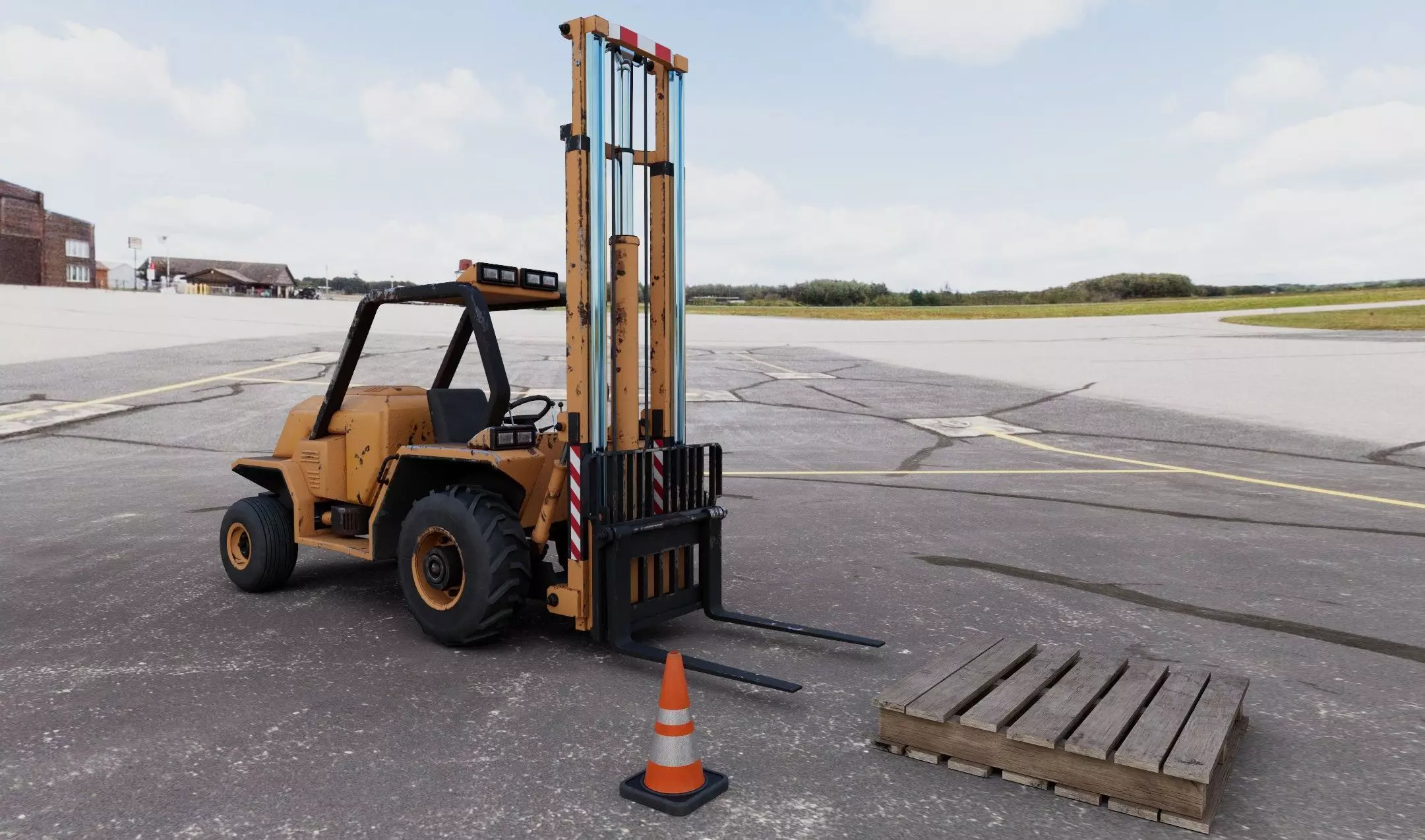 High-Quality 3D forklift model perfect for industrial visualizations, games, and animations. Features realistic proportions based on standard warehouse forklifts with detailed mechanical components. Including also wood pallet and traffic cone.