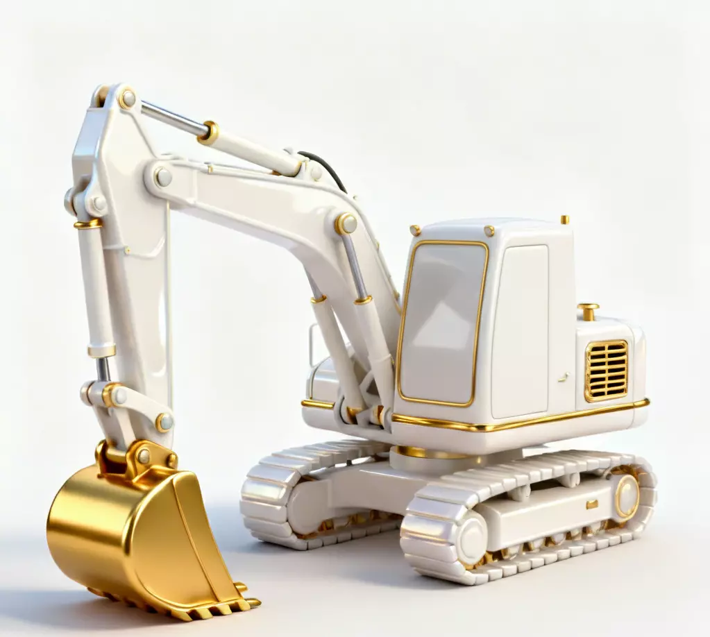 High-Performance Pearl TreadsThe excavator moves on a set of wide, pearlescent white crawler tracks with golden link pins. These detailed treads ensure the vehicle looks grounded and powerful while maintaining its elegant, high-fidelity aesthetic.