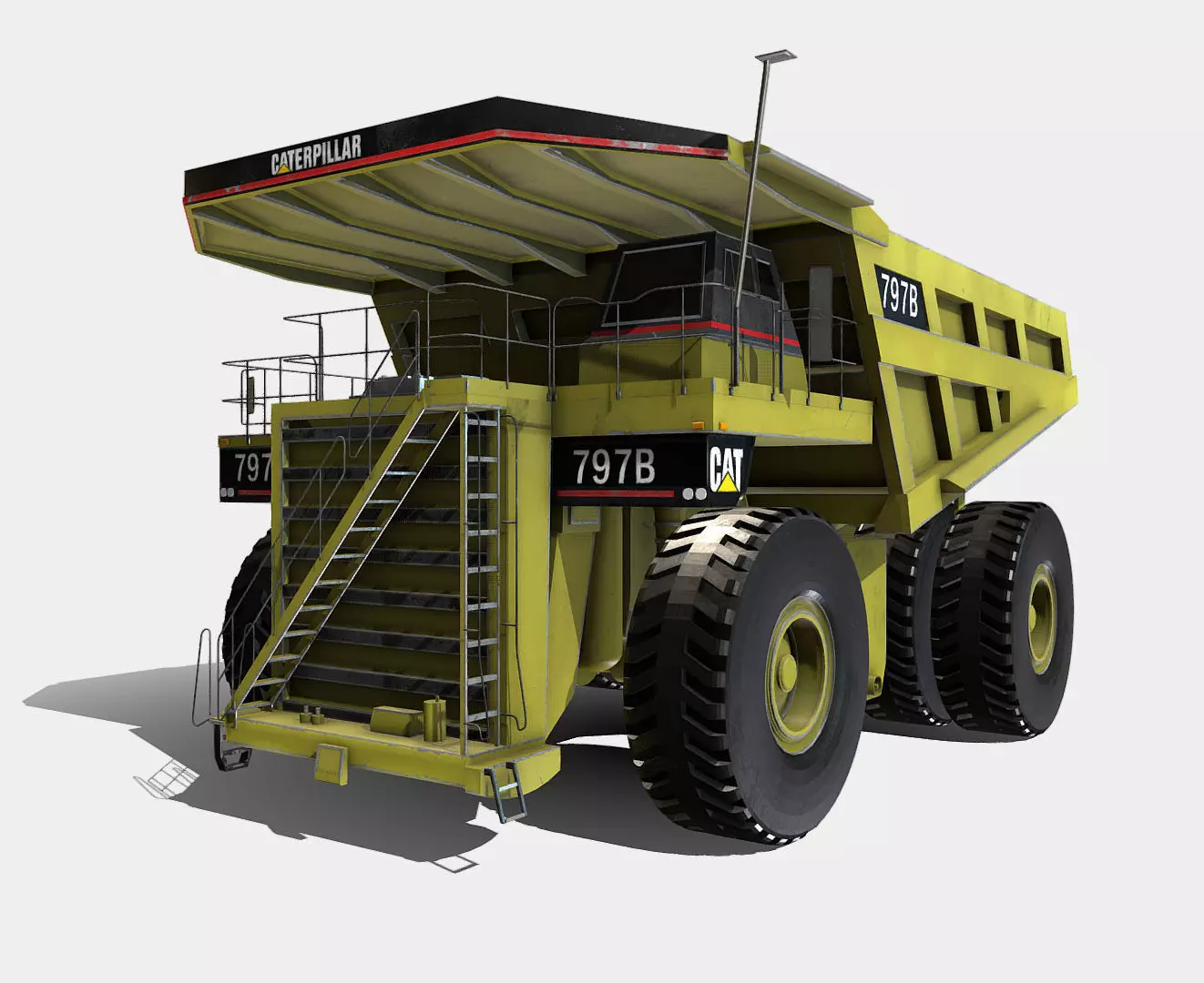 Model: Cat 797B Media Type: 3D Model Geometry: Quads/Tris Polygon Count: 35047Vertice Count: 33809 Textures: Yes Materials: Yes Rigged: No Animated: No UV Mapped: Yes Unwrapped UV's: Yes Non Overlapping