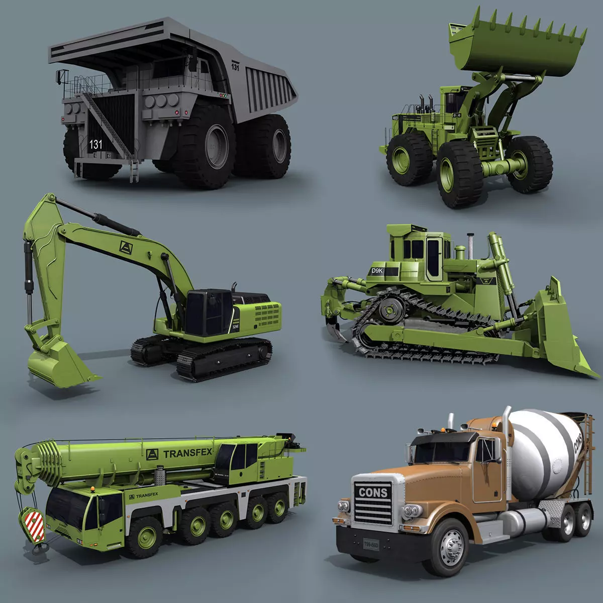 cement truck: 80054 polygons, 88146 vertices wheeled crane: 113901 polygons, 120991 vertices bulldozer: 53345 polygons, 63707 vertices excavator: 70778 polygons, 77309 vertices loader: 41818 polygons, 48935 vertices dump truck: 47027 polygons, 53639 vertices