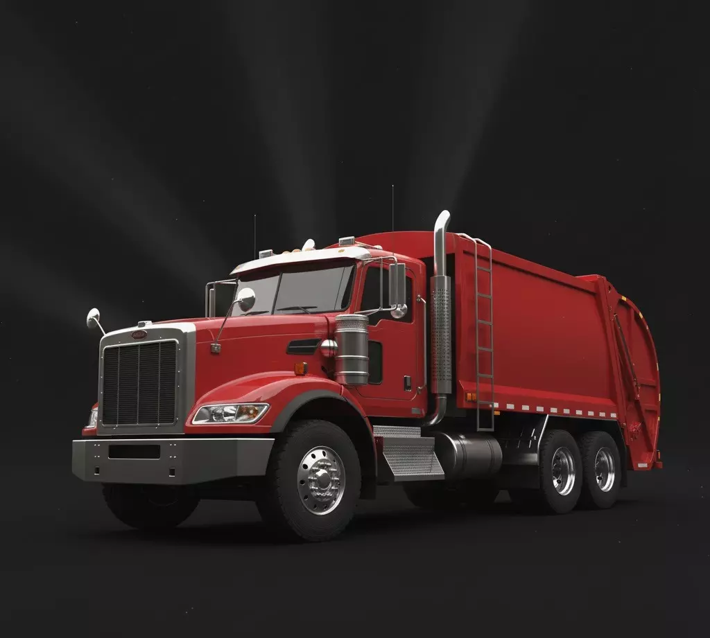 The truck's bright red body, a color often associated with utility and visibility, stands out against the more subdued tones of the surrounding buildings and greenery. The most prominent feature is the front-loading mechanism, with its large collection bin raised high above the cab, poised either to empty its contents or having just completed the task. This illustrates the specialized function of the vehicle for efficient waste management.Details such as the multiple axles with heavy-duty tires, the robust chassis, and the various hydraulic hoses and mechanical parts are clearly visible, emphasizing the truck's industrial-grade construction. The setting includes apartment buildings in the background, mature trees, and a paved road with clear yellow markings, indicating a typical urban street scene. The lighting appears natural, suggesting an outdoor daylight setting, which highlights the textures and contours of the truck's metallic and rubber surfaces. The overall impression is one of purposeful activity and essential public service.