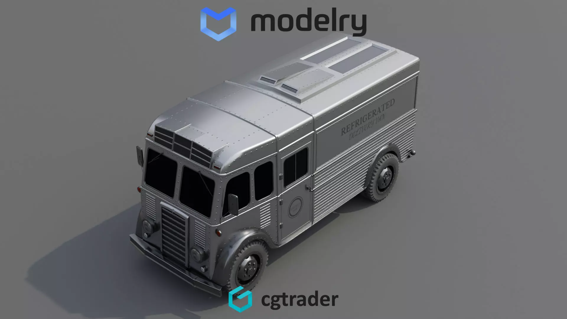 A refrigerated truck from the historical timeline, featuring a sleek silver exterior with rounded edges, large windows, and a prominent logo of the delivery company on the side. The truck is equipped with a unique cooling system, visible through vents on the top, ensuring the safe transportation of perishable goods. The wheels are sturdy and black, contrasting with the metallic body of the truck.