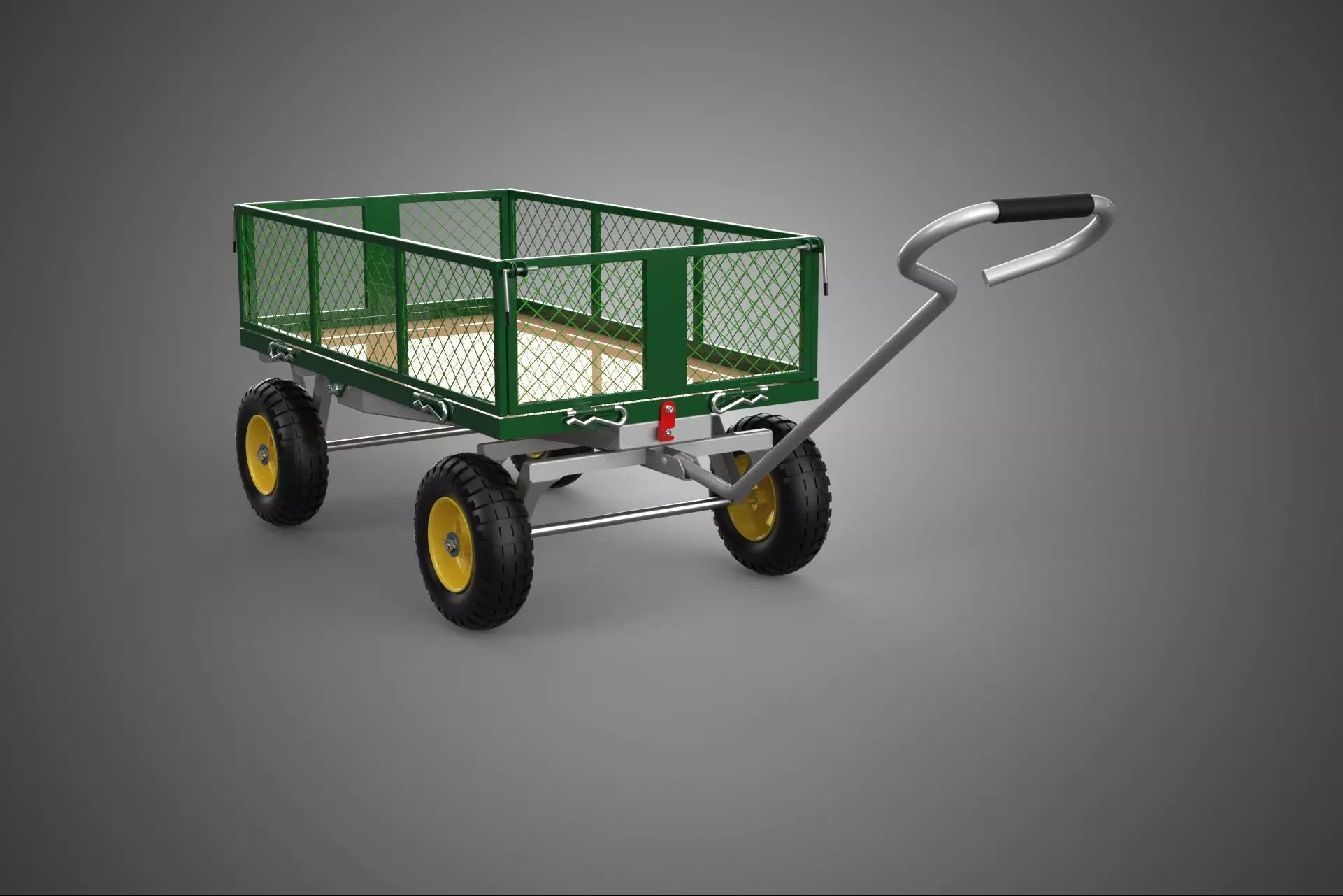 KEYWORDS: Utility wagon, garden cart, dump wagon, steel mesh, four-wheeled, pneumatic tires, cargo trolley, heavy-duty, landscaping, horticulture, material handling, hauling, quick-release, articulated steering, powder coating, garden equipment, yard waste, bulk materials, high load capacity, steel frame, stable transport, non-tipping, wheelbarrow substitute, dump mechanism, articulated axle, multi-purpose, outdoor utility, equipment transport, debris removal, ergonomic design.