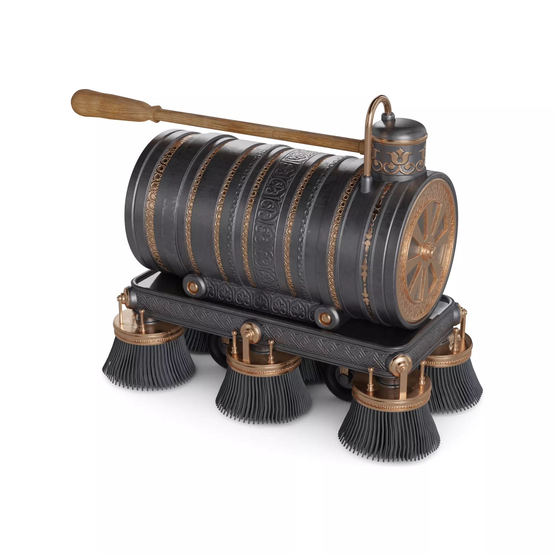 A street sweeper from the historical timeline, designed for special purpose/utility and service, featuring a large cylindrical shape with a metallic silver body and intricate brass detailing, equipped with rotating brushes and a wooden handle for manual operation.