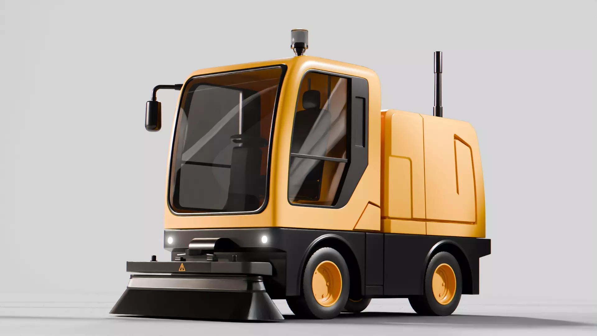 A compact and agile street sweeper in a bright yellow hue, featuring advanced sensors and automated cleaning mechanisms, ensuring thorough sanitation of public spaces, tailored for contemporary city maintenance.