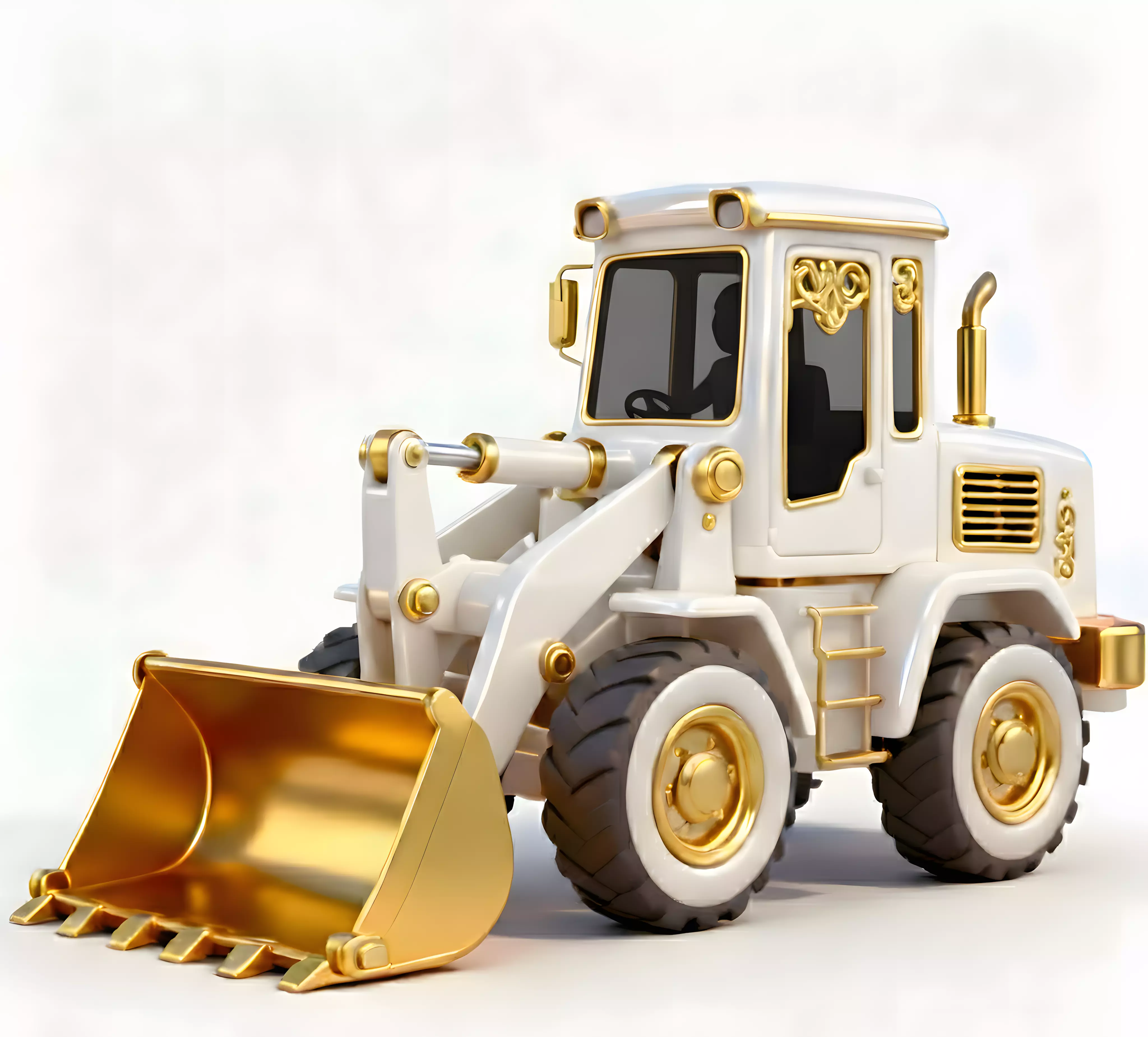 Solid Gold Front BucketTo emphasize its elite status, the model is equipped with a massive, solid gold digging bucket. The polished metallic finish features realistic tooth-edge detailing, providing a stunning visual contrast to the white chassis and signaling its high-value role.