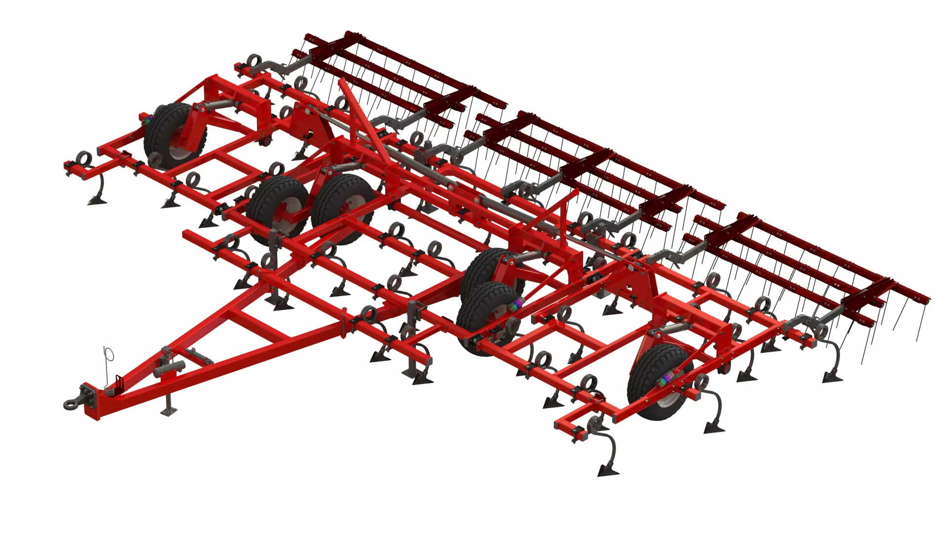 Field Cultivator – is a soil cultivation implement designed for seedbed preparation and general field tillage. Field cultivators can also be used for secondary tillage to control weeds.The field cultivator is available in various working widths (4, 6, 8, or 10 meters). The 6, 8, and 10-meter models have a three-section folding frame for easier transportation. Key features include S-shaped or C-shaped spring tines with sweeps up to 250 mm wide, optional attachments such as three rows of tine harrows, and tandem wheels for improved ground contour following. Specific models may vary in specifications and dimensions depending on the configuration.The unique frame design allows for extensions to increase the working width, or for reducing the overlap between the sweeps to lower the tractor's power requirements and/or save fuel consumption.Five rows of working elements provide excellent soil loosening and complete weed cutting. The tines are mounted with a single bolt, allowing for quick and easy replacement. Precise depth adjustment of the sweeps is achieved by installing aluminium stops on the hydraulic cylinder rods, both on the wings and on the main frame.The tine shanks are equipped with spring protection to prevent damage. The implement’s wheels are mounted on tandem supports, which allow it to better adapt to field irregularities and ensure smooth transportation. The three rows of spring harrows perfectly level the soil surface, thus providing optimal seedbed preparation.