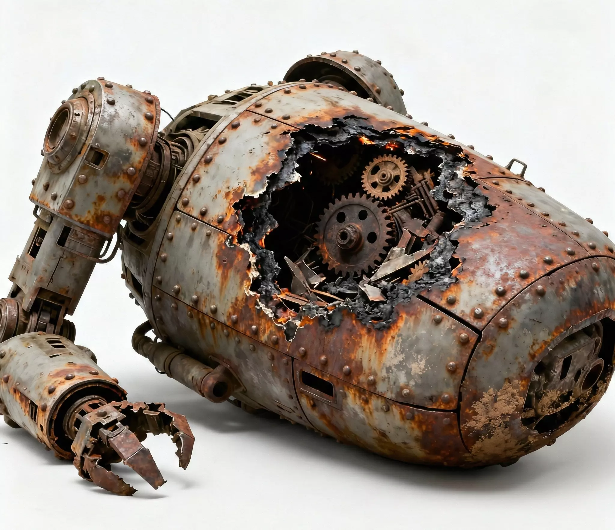 Shattered Internal Mechanism A massive impact breach tears through the center of the chassis. Inside the jagged, blackened opening, you can clearly see the static, rusted cogwheels and gears that once powered the machine. This internal geometry adds significant depth, rewarding players who look closely at the debris.