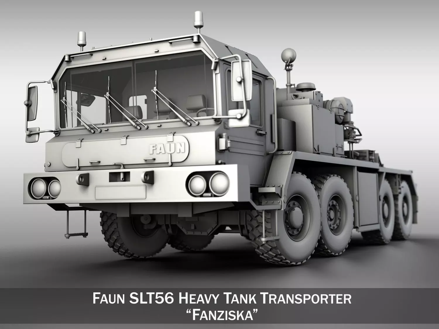 The heavy transporter Franziska belongs to the Bundeswehr‘s 3rd generation of vehicles and extends the ability to carry extra heavy tanks. While the STL56 is externally similar to the SLT50, it is in fact an independently and completely new developed vehicle. The best way to tell the SLT56 apart from the Elefant are the tandem lights the SLT56 carries in the front bumber, while the Elefant only has single lights. Technically, they differ in the drive train and the engine. The trailer is also different, as is the configuration of the winches and boxes. Similar to the Elefant, the SLT56 is equipped with two Rotzler winches for pulling tanks or other disabled vehicles onto the trailer.