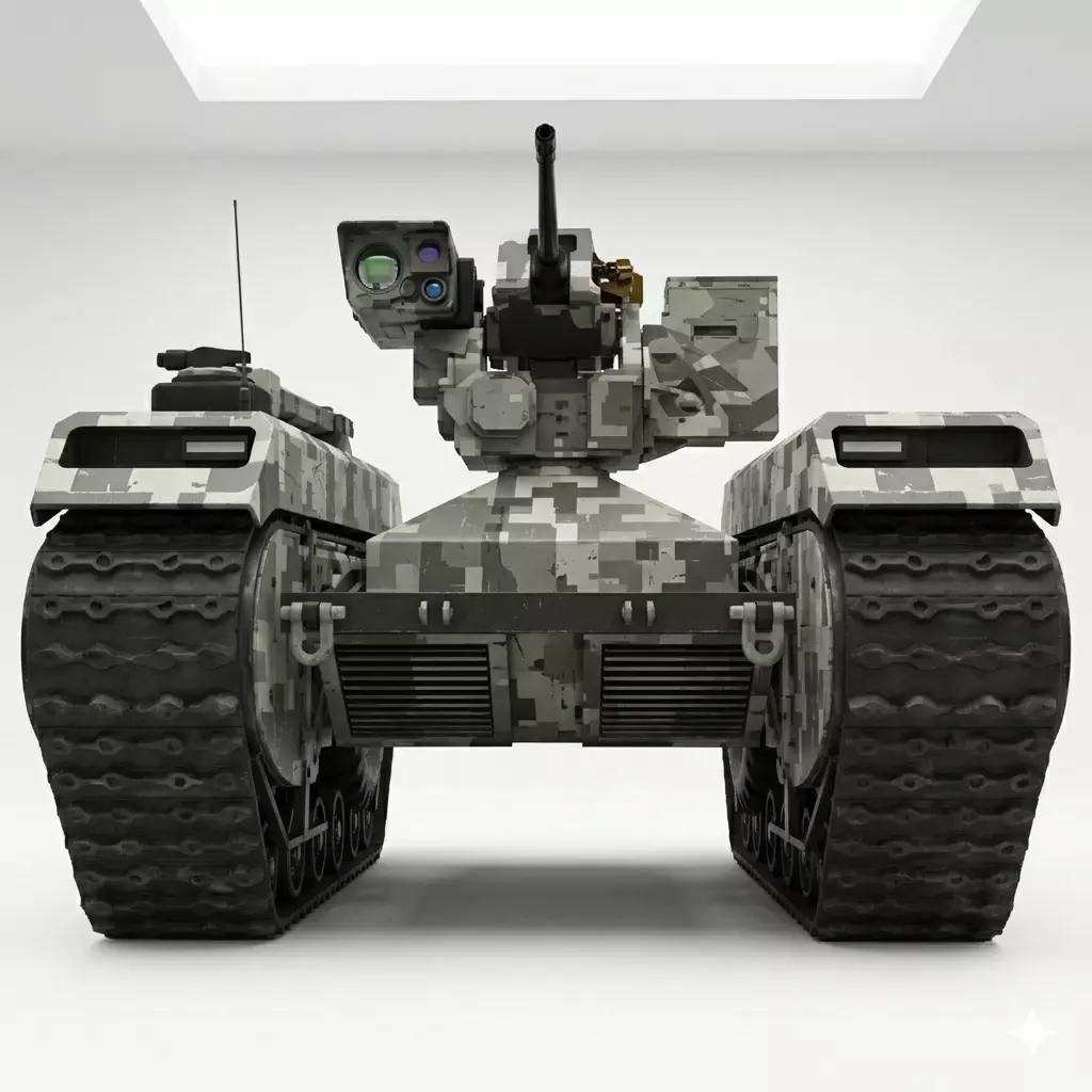This advanced Unmanned Ground Vehicle (UGV) is designed for high-stakes reconnaissance and tactical support in diverse environments. Featuring a ruggedized, all-terrain hybrid drive system, the vehicle utilizes a unique track-over-wheel configuration to ensure maximum mobility over soft soil, debris, and steep inclines. The platform is draped in a digital urban camouflage pattern and is equipped with a sophisticated Remote Weapon Station (RWS) mounted on a central 360-degree turret. This combat module integrates a high-caliber machine gun alongside an electro-optical sensor suite, including thermal imaging and a laser rangefinder for precise target acquisition. Engineered for remote operation or autonomous waypoint navigation, this tactical robot serves as a force multiplier, providing a low-profile, high-impact solution for modern perimeter defense and hazardous zone exploration.