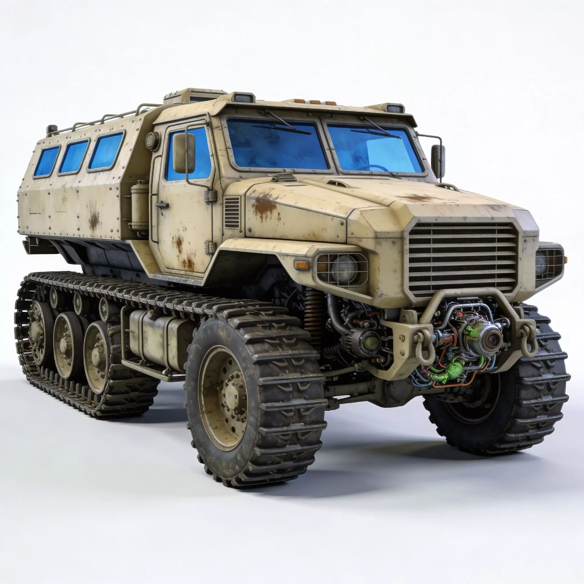 Key FeaturesHybrid Propulsion Geometry: Accurately modeled transition between steering wheels and heavy-duty rear tracks for multi-terrain versatility.