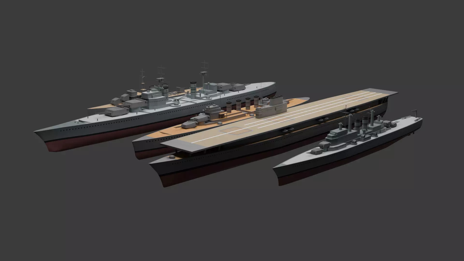 This newly completed 3D asset is a low-poly warship package that includes a small patrol boat, a destroyer, an aircraft carrier, a battleship, and two cruisers.