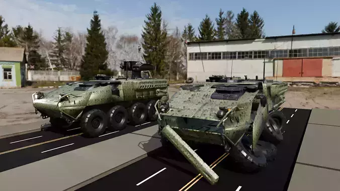 This military asset pack includes two high-quality versions of the M1134 armored combat vehicle: