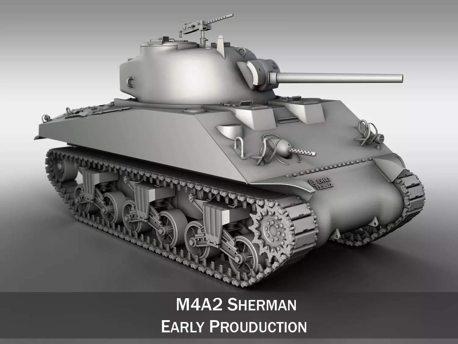 The M4 Sherman, formally Medium Tank M4, was the primary tank used by the United States duringWorld War II. The M4A2 was the only diesel engined version of the Sherman tank to see service in large numbers, mainly serving with the USSR as Lend Lease equipment and with the US Marines, the British and the Free French. As a consequence of having a diesel engine, the M4A2 version's engine deck and back end is distinctly different from all other versions of the Sherman.