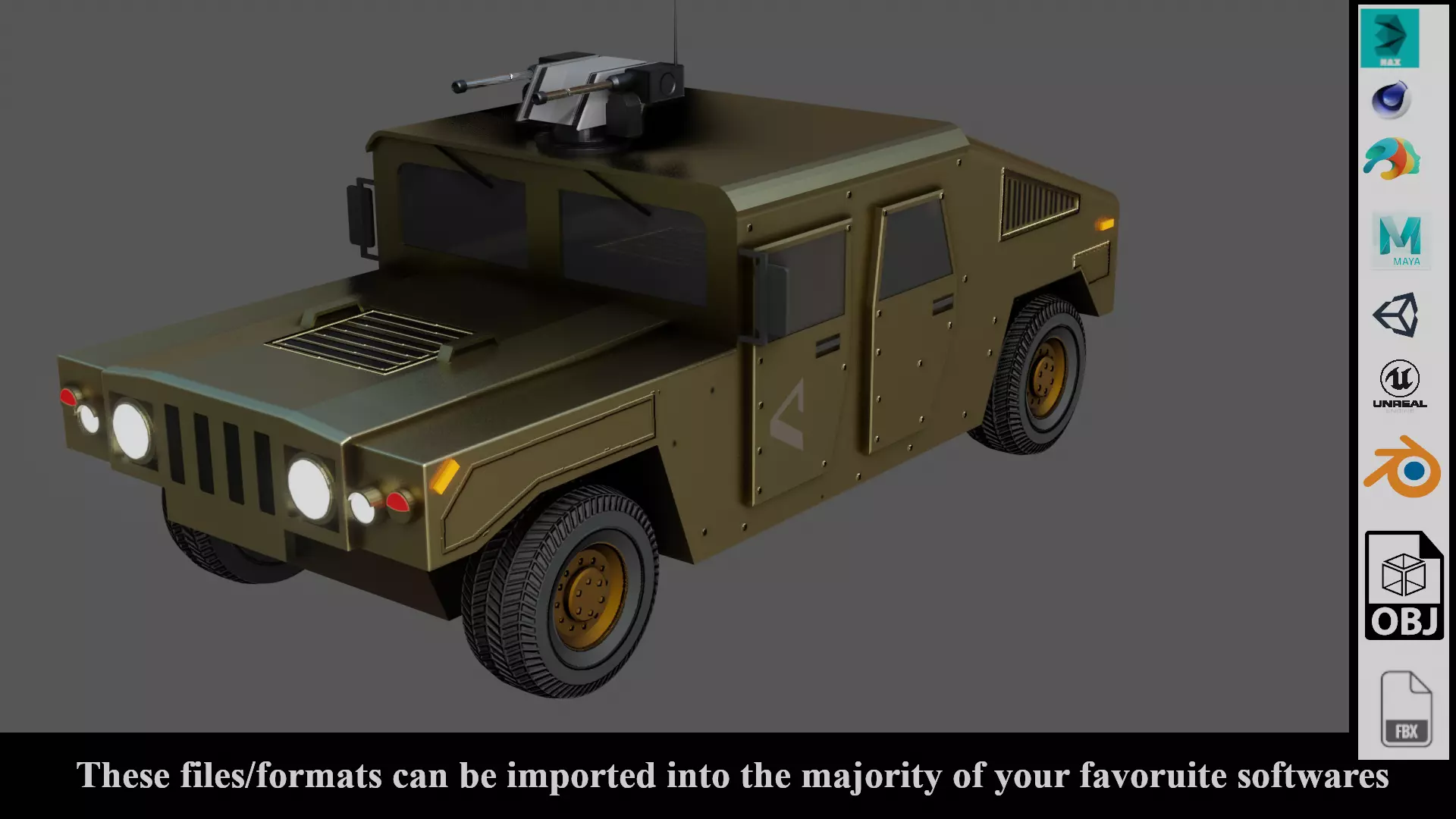This is a low poly military vehicle 3d model.This model is made in Blender 2.82.All the previews are rendered in Eevee render engine.PBR textures are used in this model.All the textures are attached with this.This is Game ready model, ready for any game engine.The tires can be animate and gun is a separate object, can be animate.