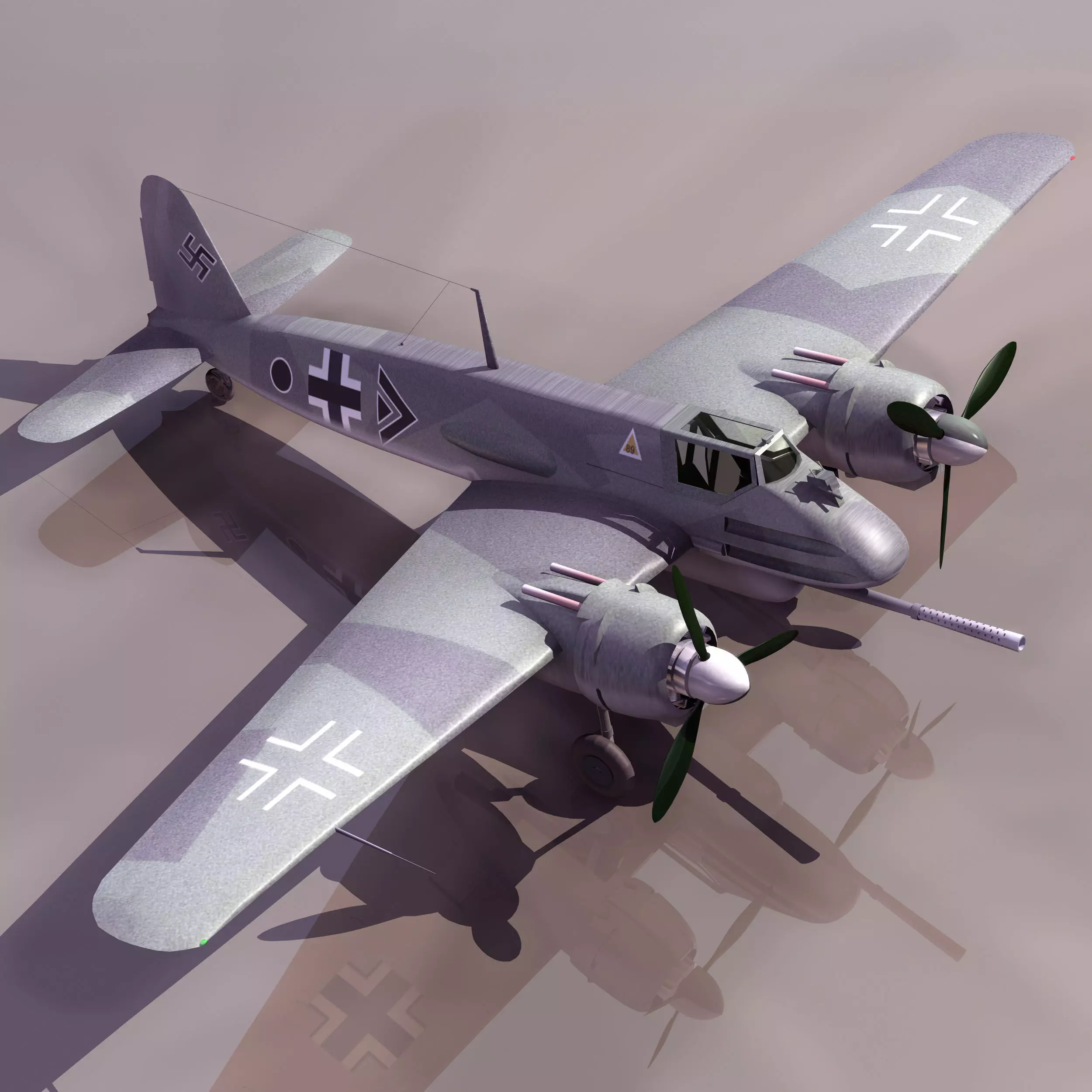 model of a World War II-era German military aircraft. The aircraft is a twin-engine, propeller-driven plane with distinctive markings, including the Balkenkreuz (cross) and swastika symbols on the wings and tail. The plane has a camouflage paint scheme with shades of gray and green. The model features two propellers, one on each wing, and a cockpit with visible windows. The aircraft also has landing gear and a gun mounted on the nose. This image is interesting and relevant because it depicts a historically significant aircraft used by the German Luftwaffe during World War II. The detailed model provides insight into the design and markings of military aircraft from that era.