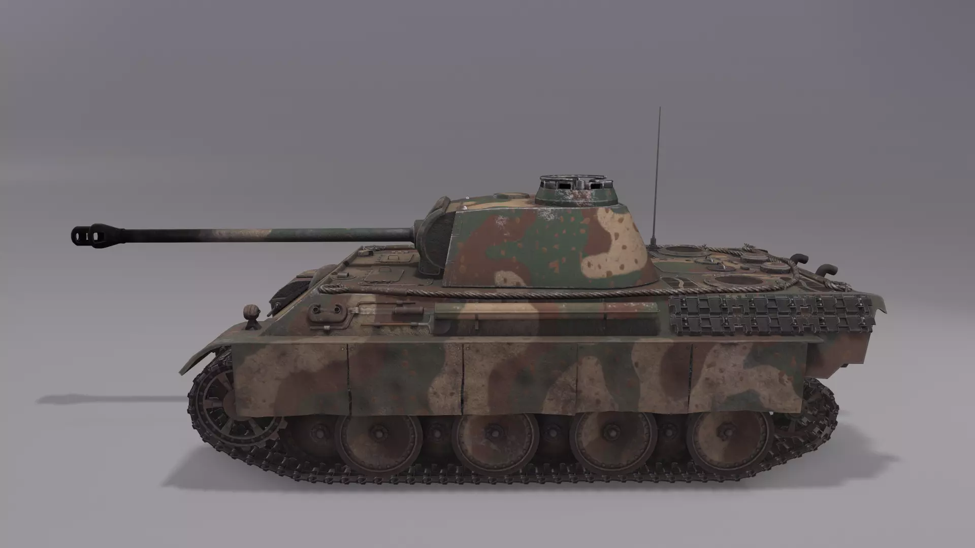 This Panther G model was made in Blender, textured in Substance Painter. Most of the outside details were done. Turret and main armament can be rotated and elevated/lowered respectively. Pivot point of the model is located in the coordinates (x0, y0). There is no opportunity to open hatches. No parent links between objects were made. There are six collections for each texture set in the scene.