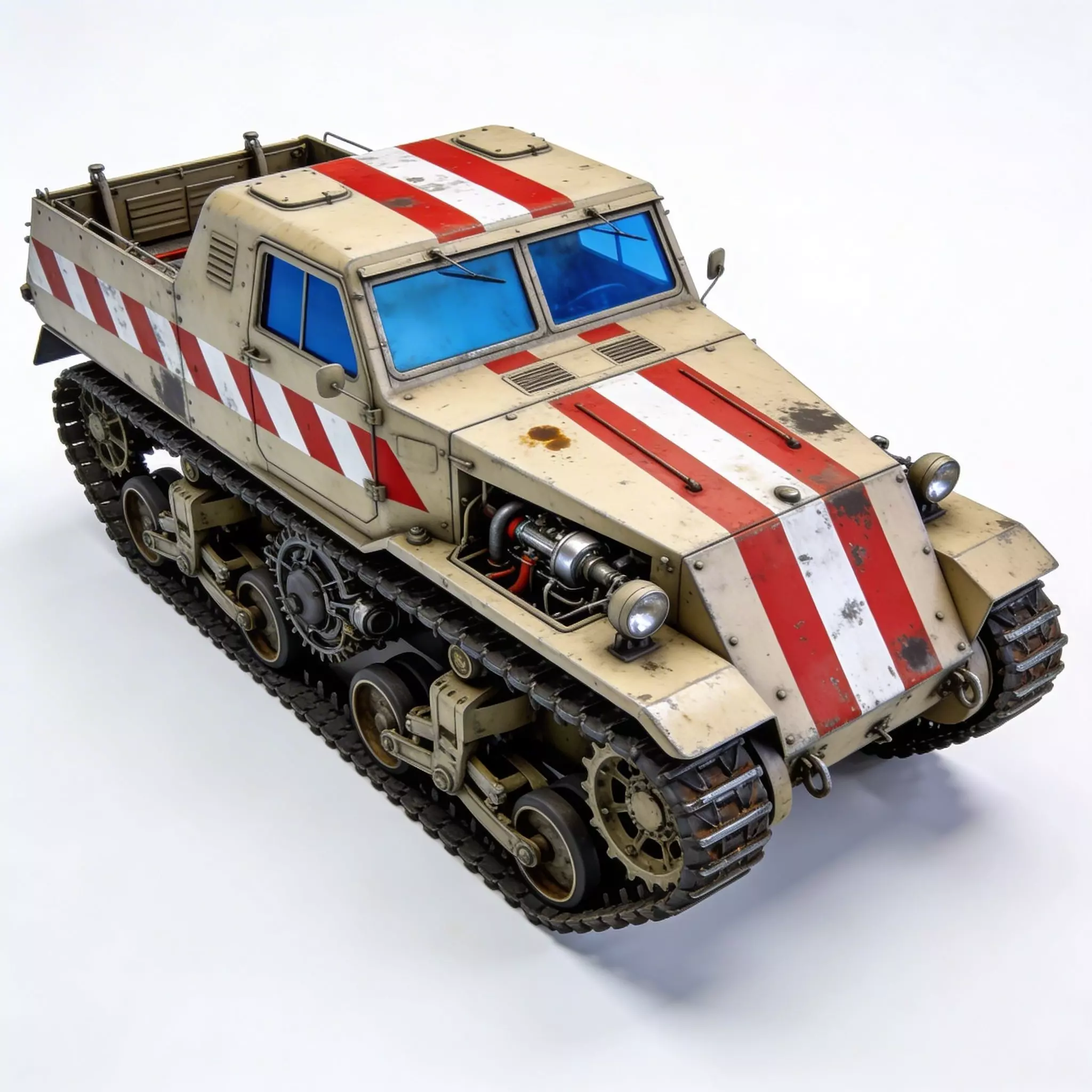 The Realistic Hard Sci-Fi Half-Track Scout is a meticulously detailed 3D model of a rugged reconnaissance vehicle built for extreme terrain. This model features a heavy-duty continuous track system integrated with a low-profile, armored cabin in a weathered desert-tan finish. The exterior is highlighted by bold red and white hazard stripes, emphasizing its military or search-and-rescue utility. The design includes an exposed engine bay with realistic mechanical components, blue-tinted tactical windows, and high-fidelity surface textures showing authentic rust, grime, and paint chipping. This battle-worn scout vehicle is a perfect high-quality asset for post-apocalyptic settings, military simulations, or sci-fi cinematic environments.