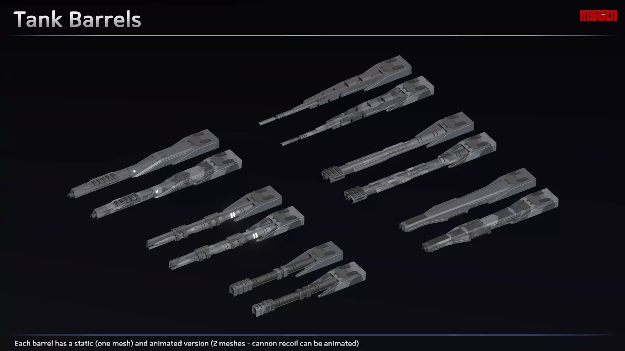 This pack contains weapons and equipment to upgrade scifi tanks and vehicles. They can be used in RTS or tank games.