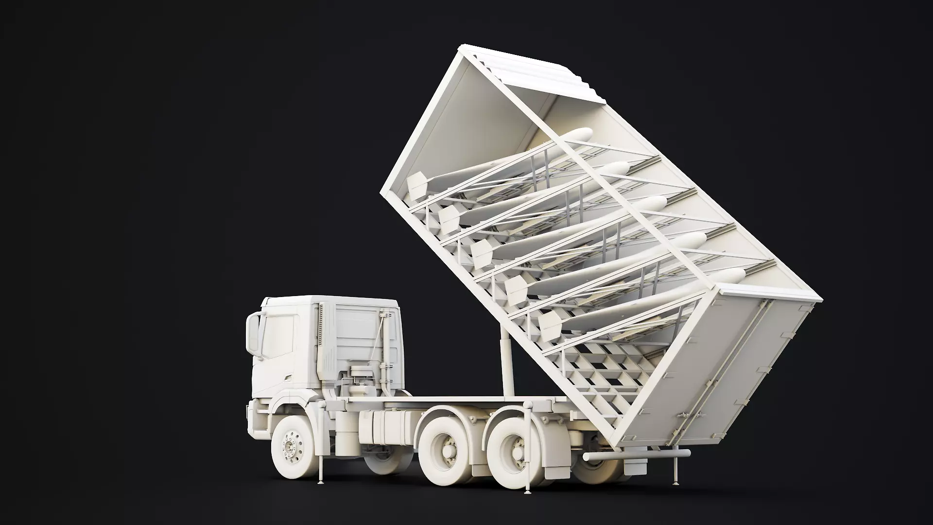 This high-quality 3D model represents a Shahed-136 drone launcher truck, built as a realistic and detailed military UAV launch platform. The asset includes a tilting container rack system equipped with multiple drone launch rails, modeled with accurate proportions and clean topology.