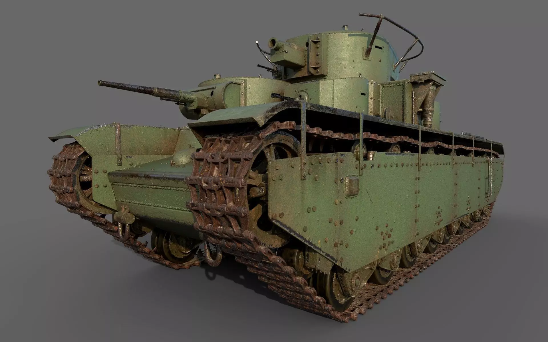 High Poly Soviet Heavy Tank T-35A beautiful 3D model prepared with care for details and hardware performance. The 3D model was created on real base. It’s created accurately, in real units of measurement, qualitatively and maximally close to the original.3D model to any of your projects, games, high-res renderings, visualization, advertising, movies, background projects. Features:Native file format 3DS Max 2016. Vray 3.4 High quality polygonal model, correctly scaled for an accurate representation of the original object. Models resolutions are optimized for polygon efficiency. Model is fully textured with all materials applied. models are grouped for easy selection, and objects are logically named for ease of scene management