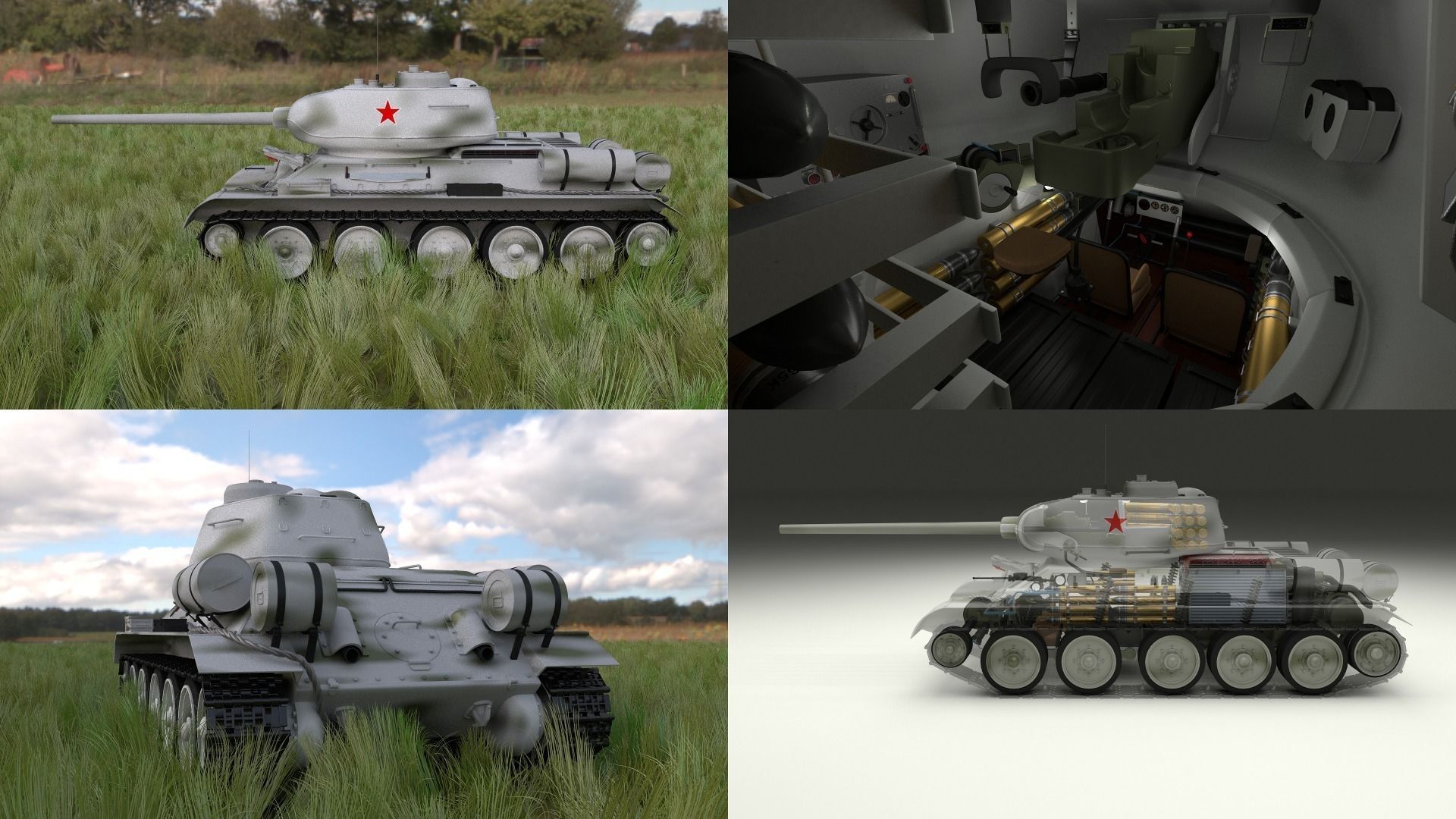The model contains a highly detailed interior(controls, gauges, machine gun, ammo, radio, main gun) and has the drivetrain(engine, radiators, transmission, tracks, suspension) fully modeled as seen in the images