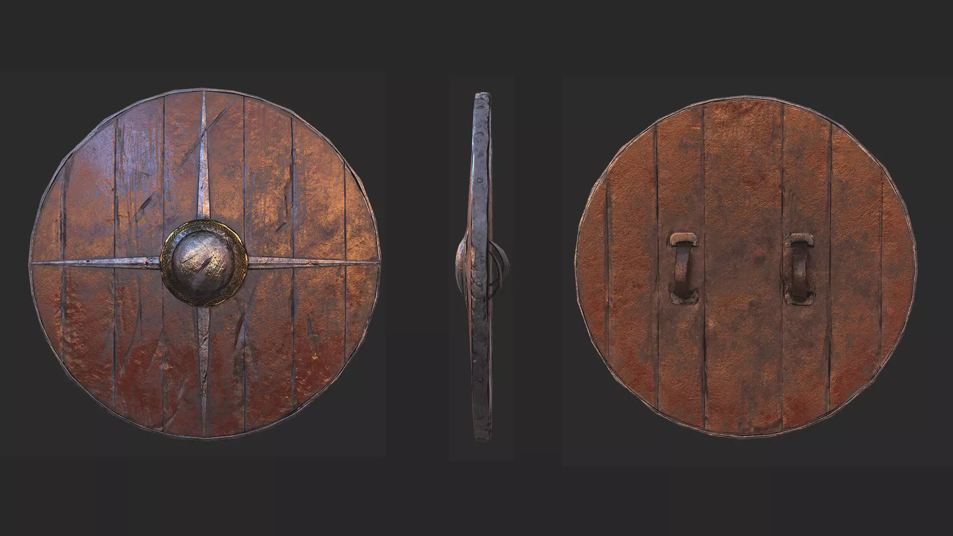 Hello, their! Here is a Viking historical round shield. Viking style round shield, steel boss, bolted steel rim, leather grip, and arm strap. In the Viking age, fighting men used large, round, wooden shields gripped in the center from behind an iron boss. Shields represent one of several instances where the literary sources and archaeological sources do not agree on how Viking weapons were constructed. The Norwegian Gulaþing and Frostaþing laws specify the construction of a shield. The shield should be made of wood with three iron bands and a handle fastened to the backside by iron nails. A later revision of the law says that the shield should be made of a double layer of boards (tvibyrðr), and the front should be painted red and white. A few shields have survived from the Viking age, notably the shields from the Gokstad ship, which date from the 10th century. The ship was equipped with 32 shields, several of which survive intact. They were made from a single layer of planks butted together, with no iron bands, and the fronts were painted black and yellow.Typical Viking shields were 80-90cm (32-36 inches) in diameter. Some were larger, such as the Gokstad shields, which were 94cm (37in) across. Based on surviving remnants, some shields appear to have been as small as 70cm (28in) in diameter. Presumably, when a man-made a shield for himself, he sized it to fit his body size and fighting style. A shield needs to be big enough to provide the desired protection but no bigger. A shield too small exposes additional lines of attack that an opponent might exploit, while a shield too large slows the defensive responses and exhausts the fighter unnecessarily.All the surviving examples are made from solid butted planks, although literary evidence, such as the 10th century Frankish poem Waltharius, and the Gulaþing laws, suggests that shields were made of laminated wood. No archaeological evidence supports this style of construction during the Viking era in Norse lands.Surviving shields are made from spruce, fir, or pine. Again, literary evidence contradicts and suggests that shields were made with linden wood (Tilia, commonly known as basswood in North America). The word lind (linden) is used to mean shield in poems such as Völuspá (50), and the term lindiskjöldr (linden shield) is used in some sagas. Linden certainly has advantages over other species of wood for shield use. It is lightweight and does not split as readily under impact as do other types of wood.