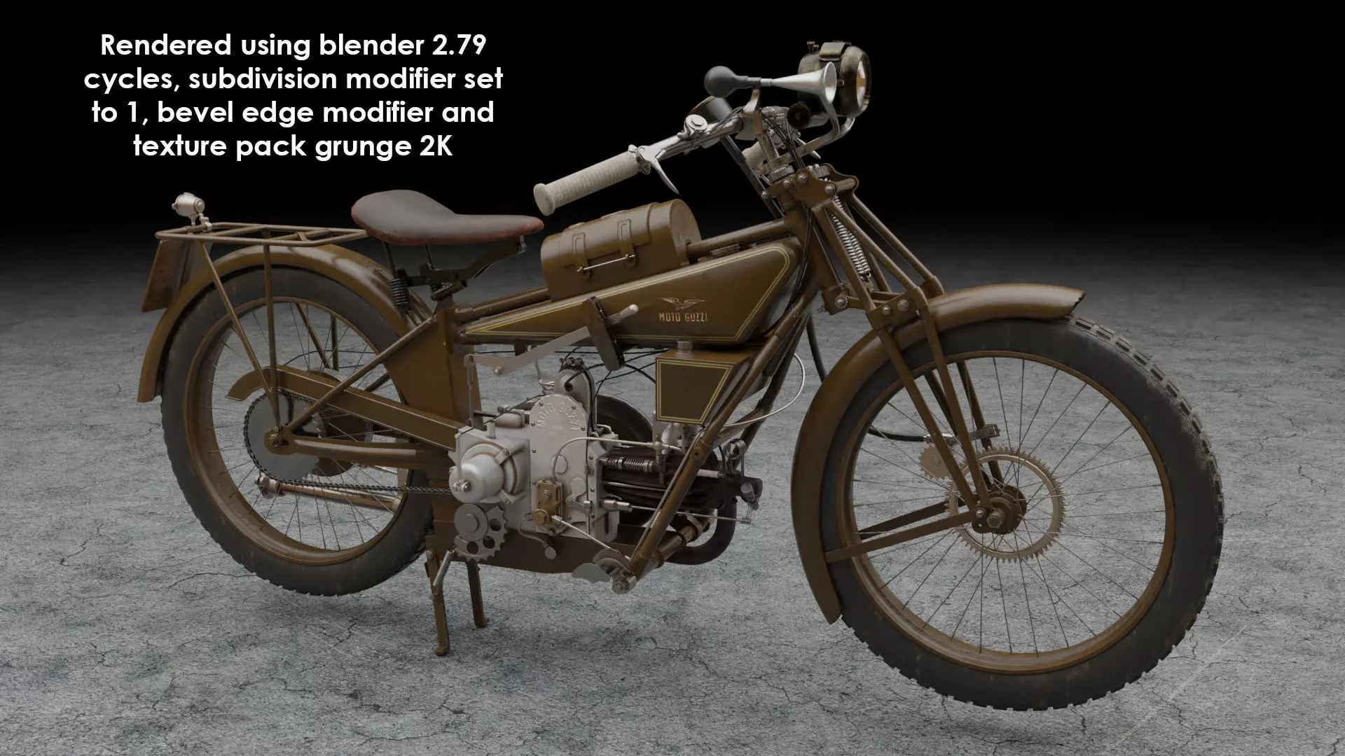 This realistic highly detailed model of a 1922 motoguzzi normale 500 motocycle uses pbr textures and comes with both basic and grunge. This model was created in blender 2.79 and uses both the bevel edge and subdivision modifiers to add geometry and control sharp edges. To improve smoothness of the model simply increase the subdivision modifier level to a higher setting in blender. The vertices, poly and tris count for the base mesh model are 65122(verts), 129678(tris), 61989(faces), for the subdivision level 1 model,the count is 760335(verts)1519848(tris),759924(faces) The model has been supplied in FBX and OBJ formats as both base mesh (subdivision =0) and ...sub1 (subdivision=1) as seen in the renders. Textures have been provided for each individual object within the model, maps include (Base, height, metallic, roughness, normal) and supplied as 2k,1k and 512kb jpeg formats for both basic and grunge texture packs. Empty control points have been added to the blender file to aid animation. This model, however, is NOT a fully rigged model Although not specifically designed as a game ready asset, this model has been opened and tested in unity