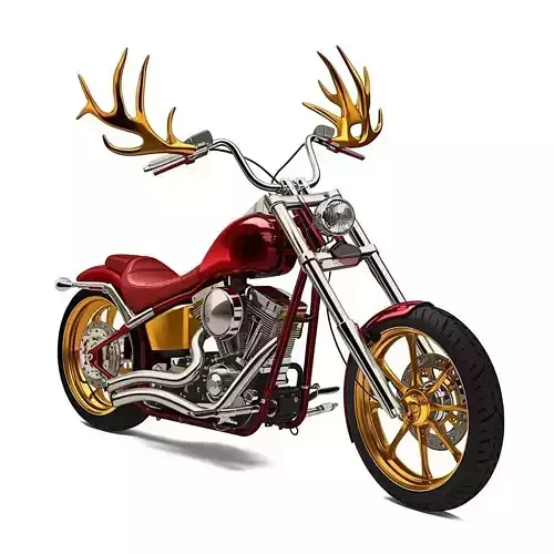 Description: Dominate the asphalt with the Crimson Stag, a custom chopper that fuses mechanical power with primal majesty. Designed for open-world driving games, high-end garage showcases, or eccentric character vehicles, this motorcycle is a statement piece. The bike features a sleek, deep crimson body that contrasts luxuriously with gold-plated rims and mechanical accents. Its most defining and surreal feature is the set of golden antlers rising from the handlebars, crowning the machine (and its rider) as the undisputed king of the road.
