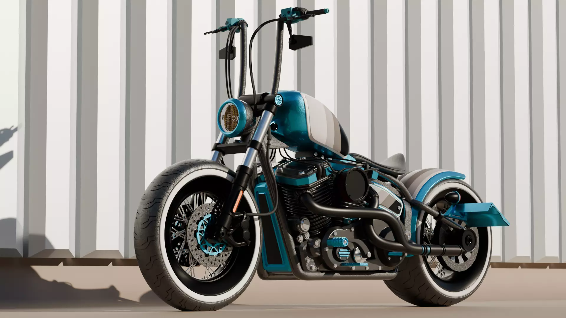 This Custom Bobber Motorcycle 3D Model features a bold retro-modern design with premium detailing and realistic mechanical components. Designed with a muscular stance, whitewall tires, exposed engine, and custom teal metallic paint, this model perfectly blends vintage bobber aesthetics with modern mechanical styling.