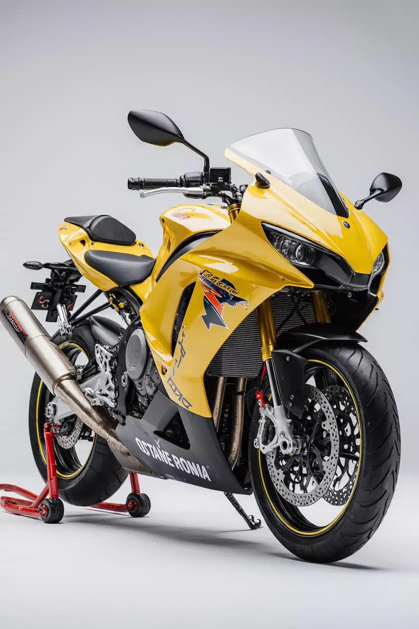 This professional-grade 3D render showcases a striking yellow and black sport motorcycle in a static, studio-like setting. The bike is meticulously detailed, from the intricate front brake calipers and large vented disc rotors to the robust, multi-piston rear caliper and high-performance exhaust system. The bodywork features bold OCTANE branding, with sharp, aerodynamic fairings that suggest high speed and agility. Its aggressive styling is further emphasized by the dual front headlights and the sleek, compact tail section. The motorcycle sits on a red and gray paddock stand, highlighting its race-ready status and stability. This image is ideal for advertising, digital media, product showcases, and any content related to motorsports, engineering, or high-performance vehicles. The clean white background ensures the subject is the focal point, making it versatile for various design applications.
