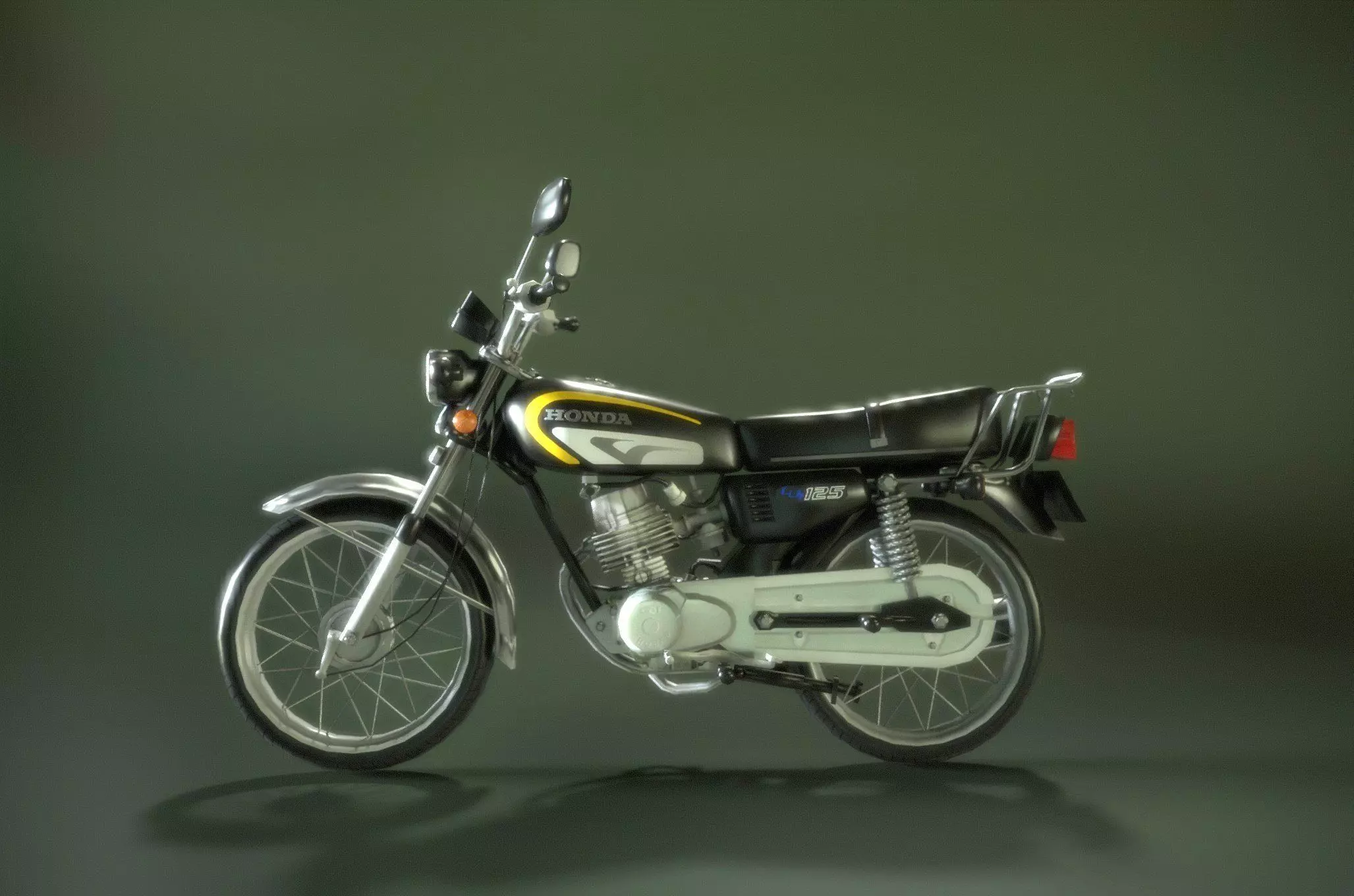Low poly model of Honda CG 125 motorcycle with 6 different color textures. textures are baked and have 2048 resolution.blender 4.1.0, front and back tire and steering are in separate meshes.