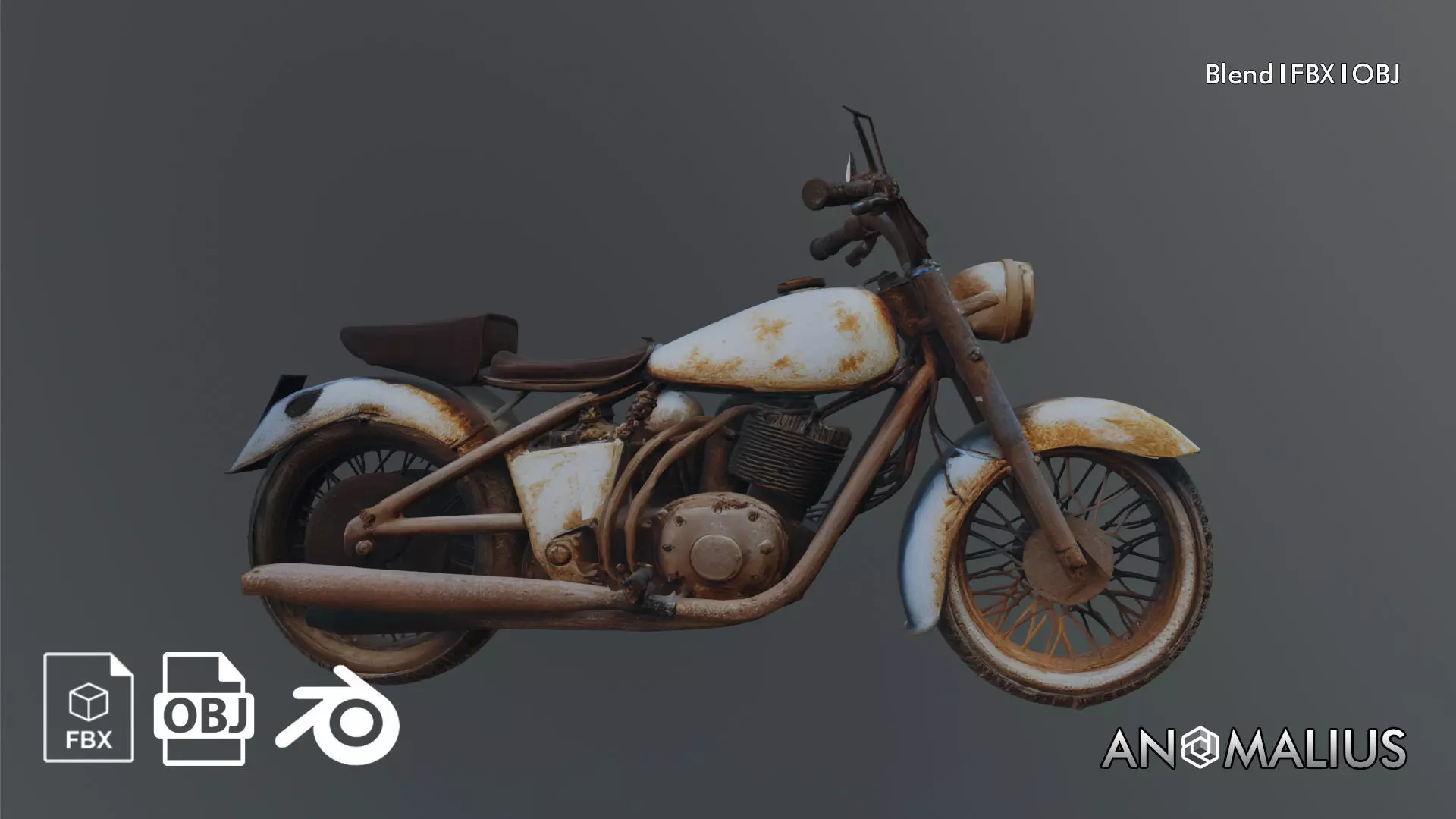 vintage motorcycle model featuring a classic frame design with visible engine components and worn, rusted surfaces. The asset emphasizes age and realism with weathered metal, chipped paint, and authentic proportions, making it ideal for post-apocalyptic, historical, or abandoned environment scenes. Suitable as a prop for streets, garages, or cinematic setup