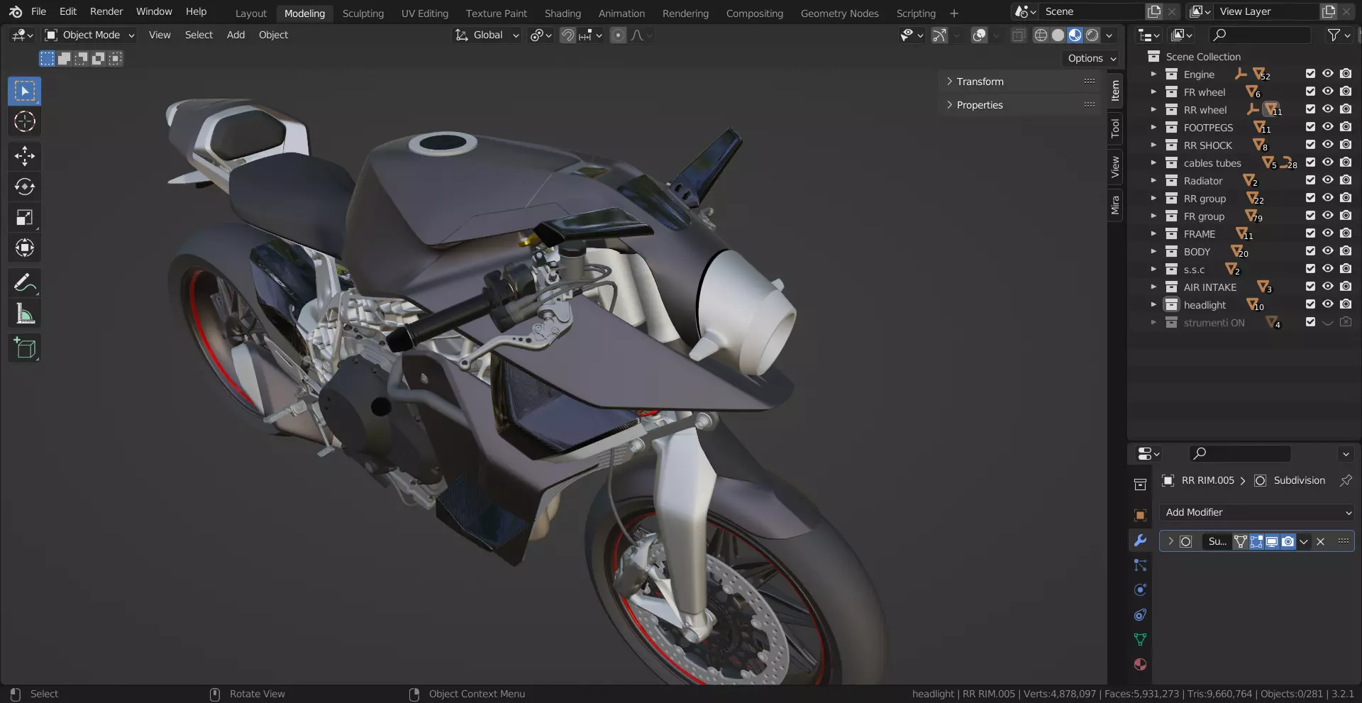 The model has material settings that define how surfaces look (color, shine, transparency, etc.).
