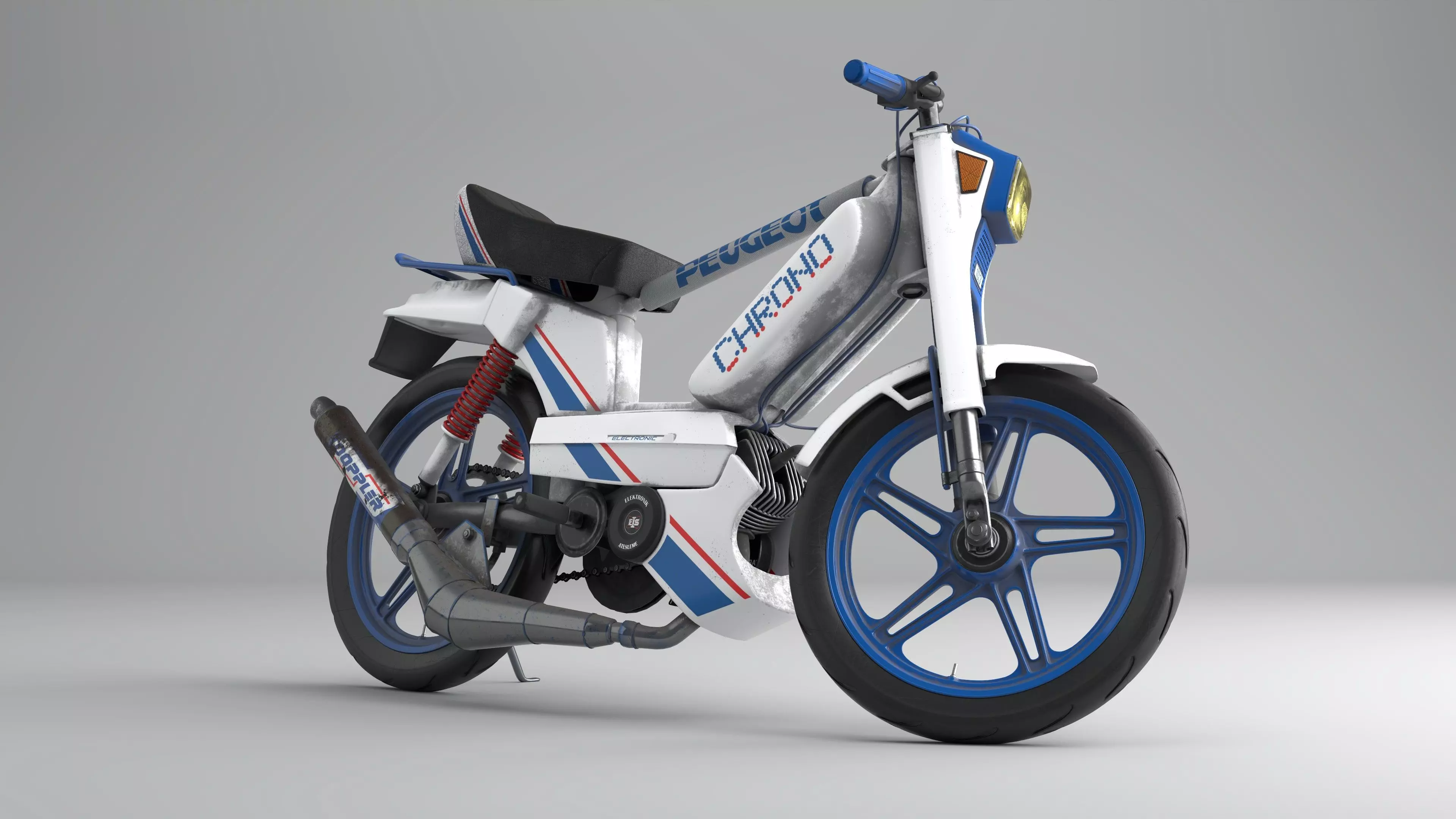 A highly realistic 3D model of the legendary Peugeot 103 Chrono, created from scratch in Blender, textured in Substance Painter, and detailed in Adobe Illustrator.