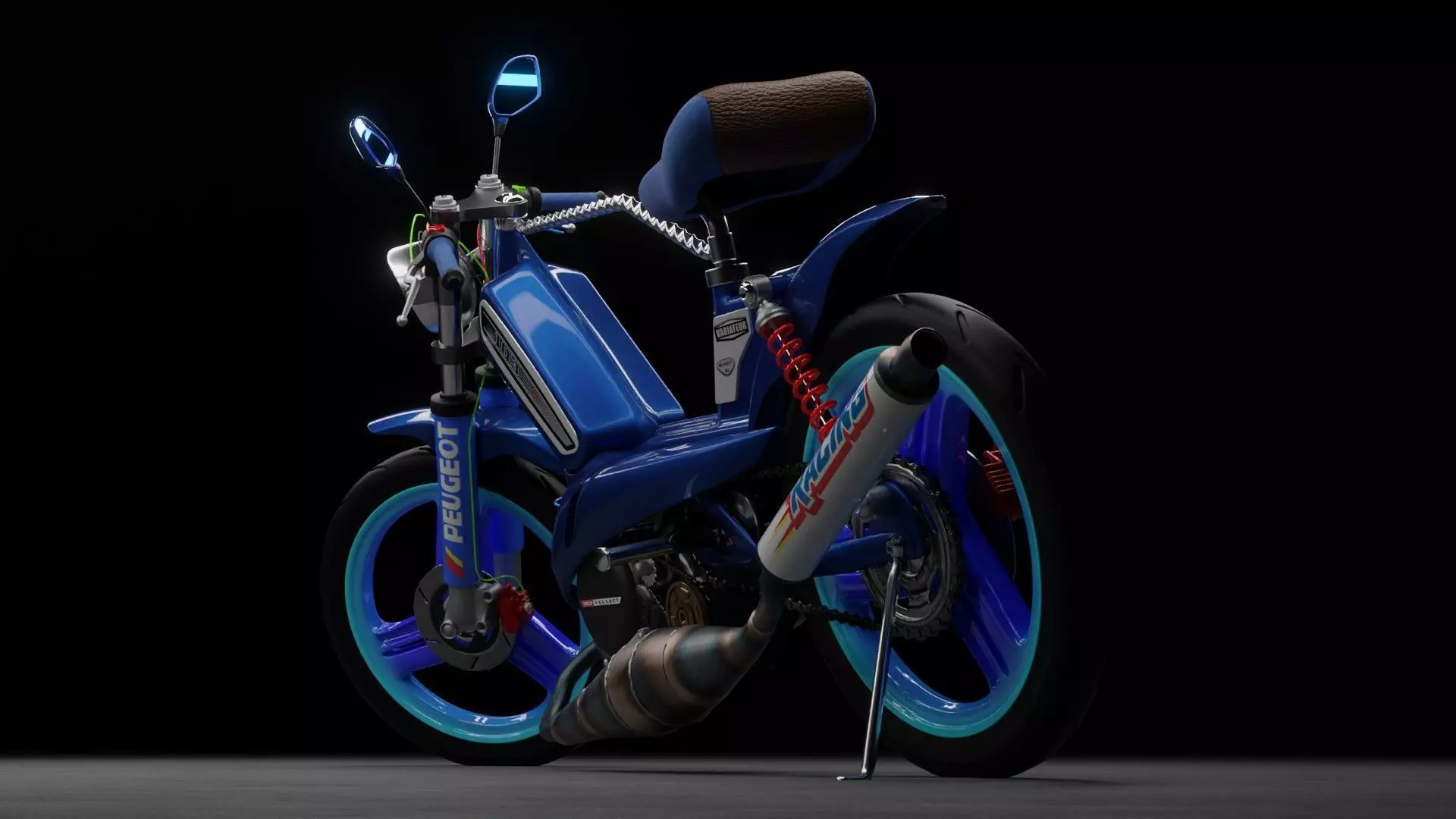 Peugeot 103 Moped (Tuning Version) 3D Model – High-Quality Blender FileBring the iconic Peugeot 103 moped to life with this customized tuning version in a detailed 3D model, designed exclusively in Blender. This unique, high-performance variant of the Peugeot 103 captures the retro charm of the original with added modern modifications to enhance its visual appeal and style.Key Features:High-Detail Design: Every component, from the frame to the engine, is meticulously modeled with precision, offering an accurate representation of both the original Peugeot 103 and its tuning enhancements.Customization and Tuning: The model showcases a sportier, modified version of the classic moped, featuring customized parts such as:Upgraded performance exhaust system.Modernized sports rims with enhanced detailing.Streamlined fairings and body modifications for a sleeker, more aggressive look.metallic paint, with vibrant blue color and materials that pop.Optimized for Rendering: Textured and UV-mapped, this model is ready for high-quality rendering in Blender or other software. It is perfect for visualizations, animations, and use in gaming environments.Realistic Materials and Textures: With advanced materials and PBR textures, this model ensures realistic lighting and shading effects, enhancing the overall presentation of the bike.Low-Poly and Game Ready: Optimized geometry with a balanced poly count ensures compatibility with real-time applications like game engines, while retaining high visual quality for renderings.Applications:Games & Simulations: Perfect for vehicle simulations, racing games, or urban environments.Product Visualization: Showcase your concepts in advertisements or presentations with this classic yet modernized moped design.VR/AR Projects: Ideal for interactive applications and immersive experiences.With its tuned modifications and authentic detailing, this 3D model is ideal for creators, designers, or developers looking for a unique, high-quality representation of a classic vehicle with a modern twist.