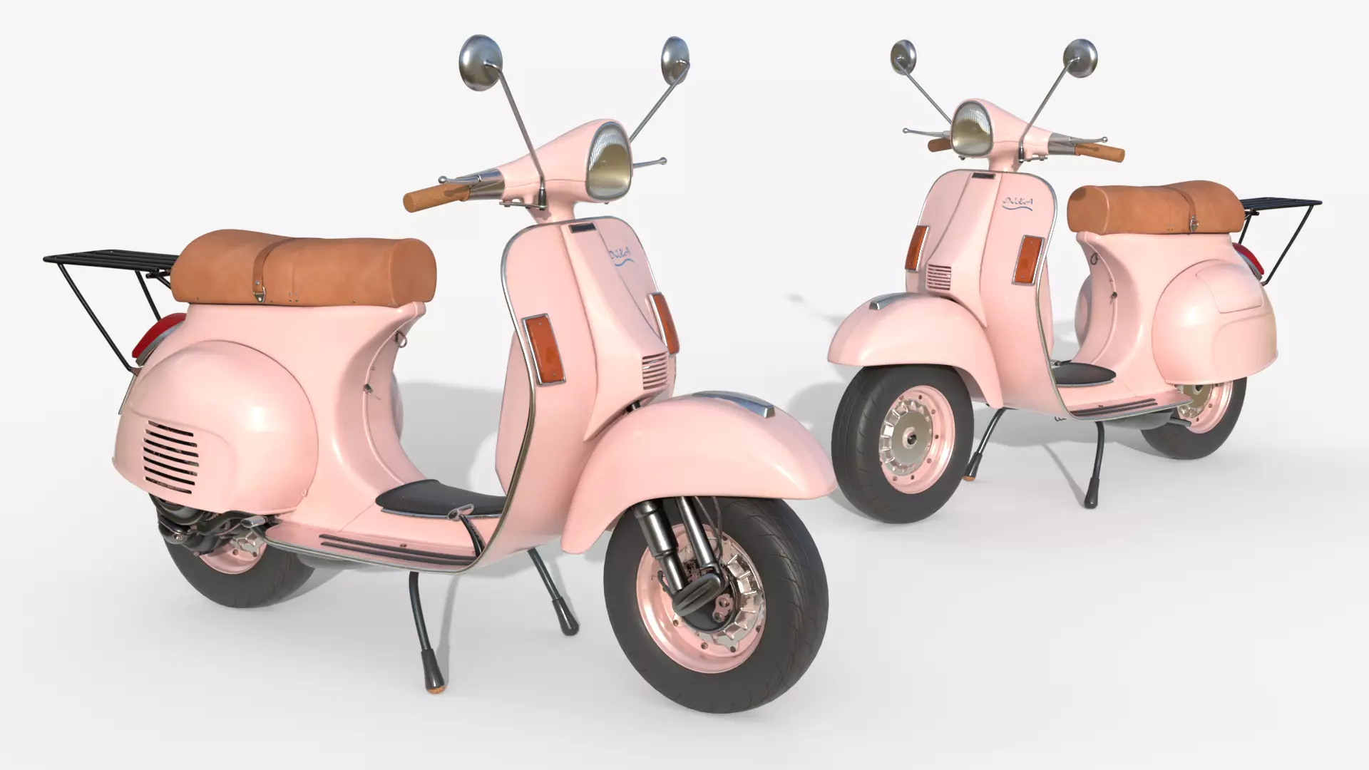 A charming pastel pink classic scooter inspired by the iconic 1960s Italian design, featuring a soft pink bodywork, tan leather saddle and grips, chrome mirrors, and a rear luggage rack. Perfect for romantic scenes, wedding visualizations, fashion renders, café aesthetics, Instagram-style mockups, and stylized feminine environments.