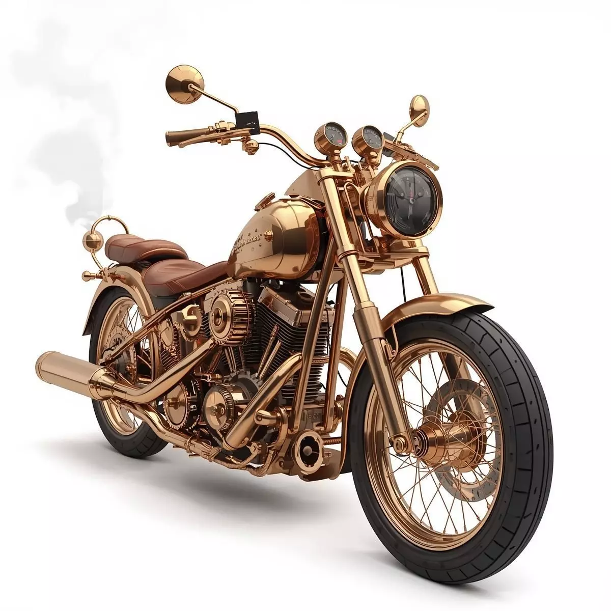 Steampunk Custom Cruiser Motorcycle 3D ModelDescriptionA premium, high-quality 3D model of a custom cruiser motorcycle designed with a rich Victorian industrial steampunk aesthetic. The vehicle features a highly polished copper and brass chassis paired with a sophisticated brown quilted leather solo seat.