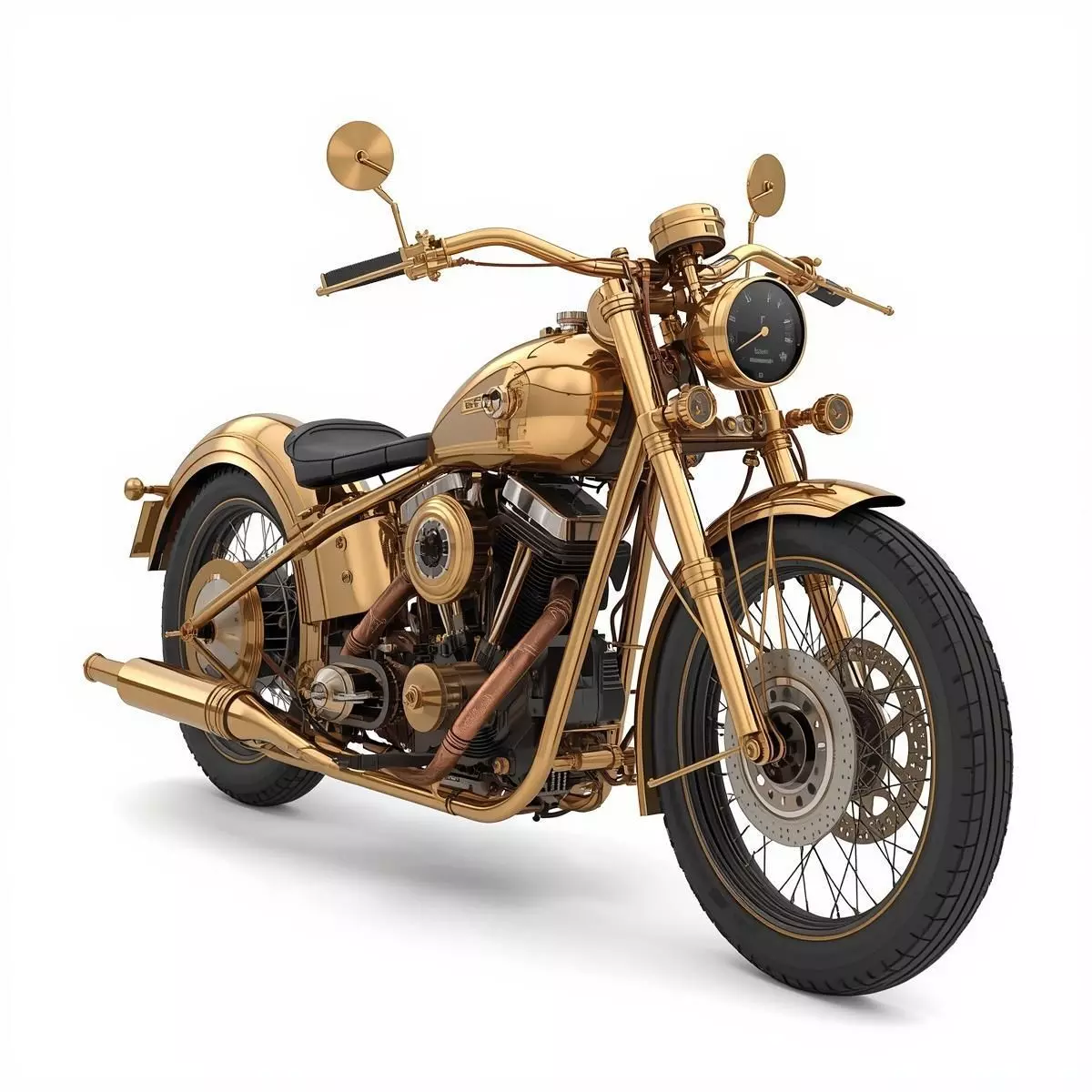 Steampunk Luxury High-Performance Motorcycle 3D ModelDescriptionA premium, high-quality 3D model of a luxury heavy-duty motorcycle featuring a sophisticated Victorian retro-futuristic aesthetic. The vehicle is meticulously crafted with a polished, reflective gold-brass frame and accented with weathered copper engine components. Its design showcases complex mechanical detailing, including exposed cylinder heads, copper heat-exchange pipes, and an intricate belt-drive system. The motorcycle features a large, front-mounted circular headlamp with a specialized dark dial face, dual circular mirrors, and a minimalist black leather solo seat. Presented as a full object isolated on a clean white background, this asset is an ideal choice for high-end hero vehicles in industrial-fantasy games, cinematic animations, or luxury retro-futuristic environments.