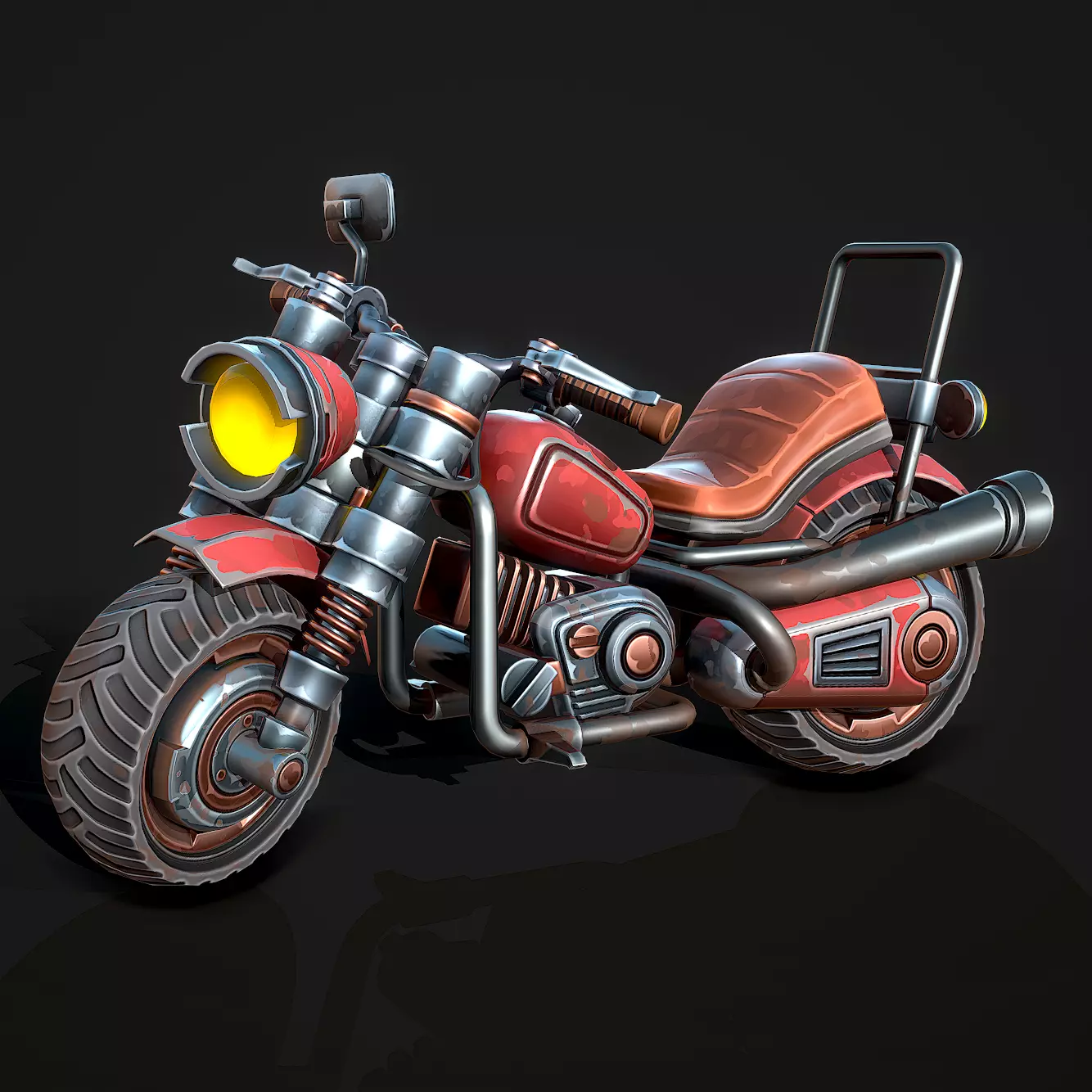 A low-poly 3D model of a Stylized Motorcycle doesn't contain n-gons and has optimal topology. The archive includes such 2K textures: base color map, metalness map, normal map (OpenGL), roughness map, and Emissive map. Images and video were rendered in Marmoset.