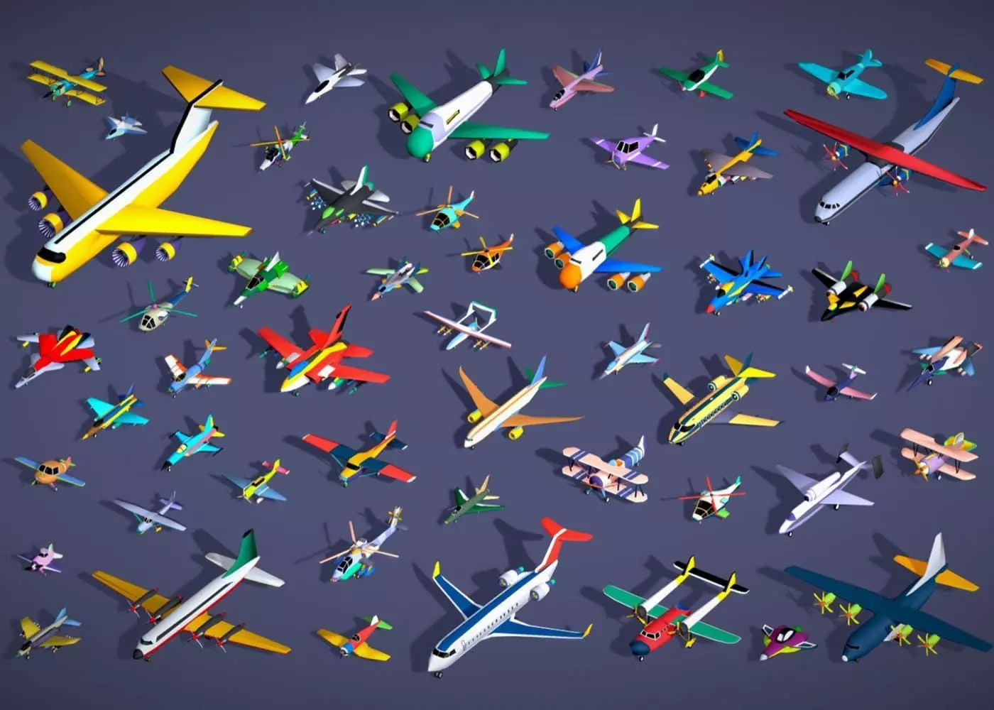 • A diverse collection of 51 unique stylized airfield vehicle models, including a wide range of airplanes, private jets, helicopters, biplanes, monoplanes, fighter jets, sci-fi aircraft, and more.
