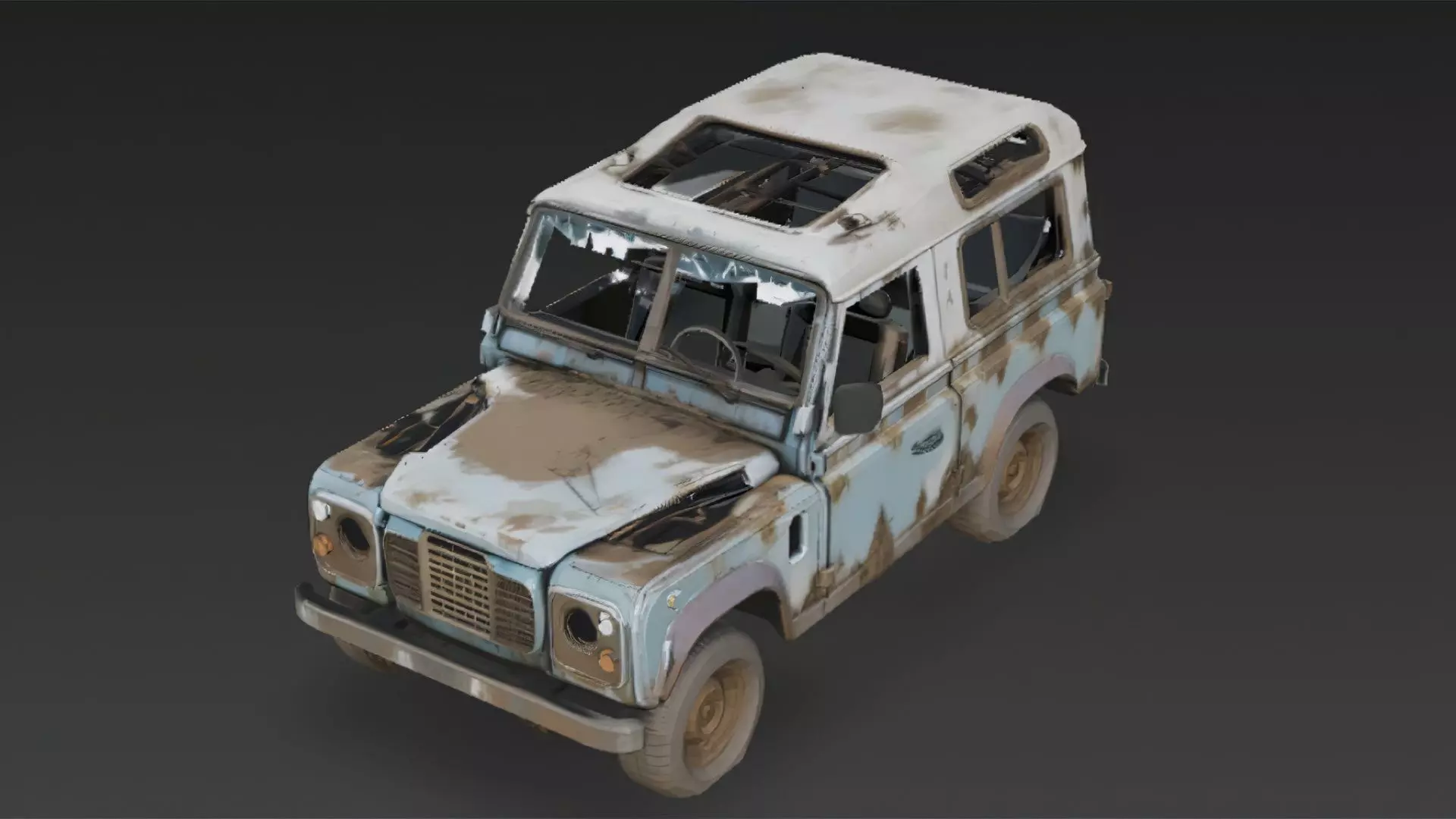 This 3D model features a heavily damaged off-road vehicle, showcasing rugged structural wear, rusted metal surfaces, and broken components caused by long-term exposure to harsh environments. The design highlights reinforced frames, worn tires, and deformed body panels, capturing the look of a once-durable vehicle left to decay.
