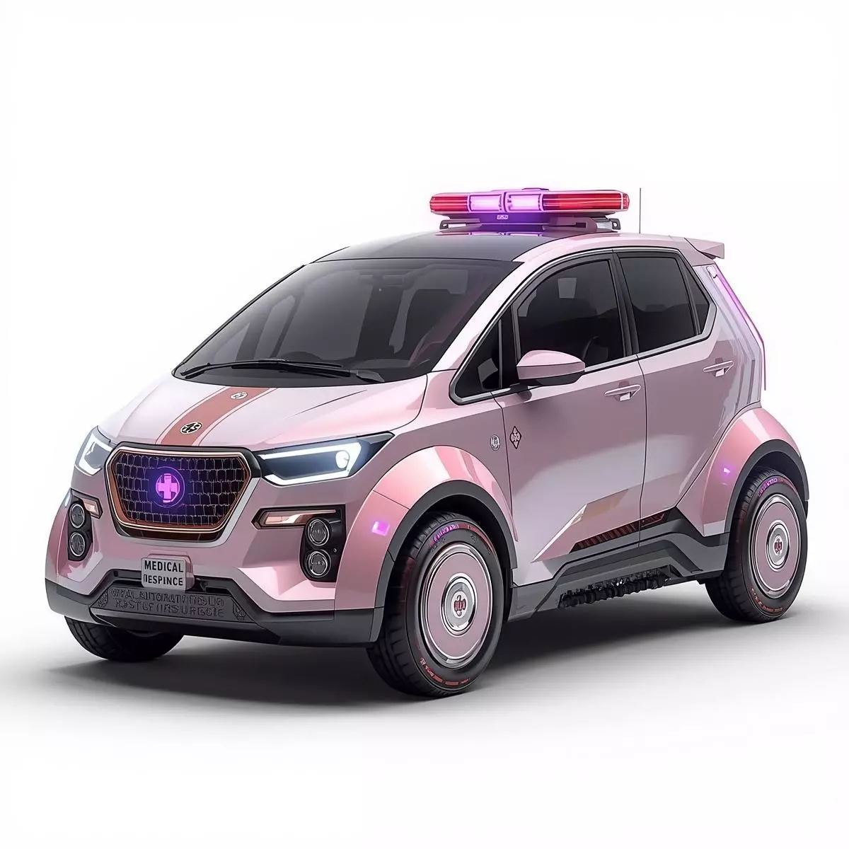 It is equipped with a roof-mounted emergency light bar emitting a soft, glowing pink and white light, complemented by an illuminated medical cross symbol on the front grille.