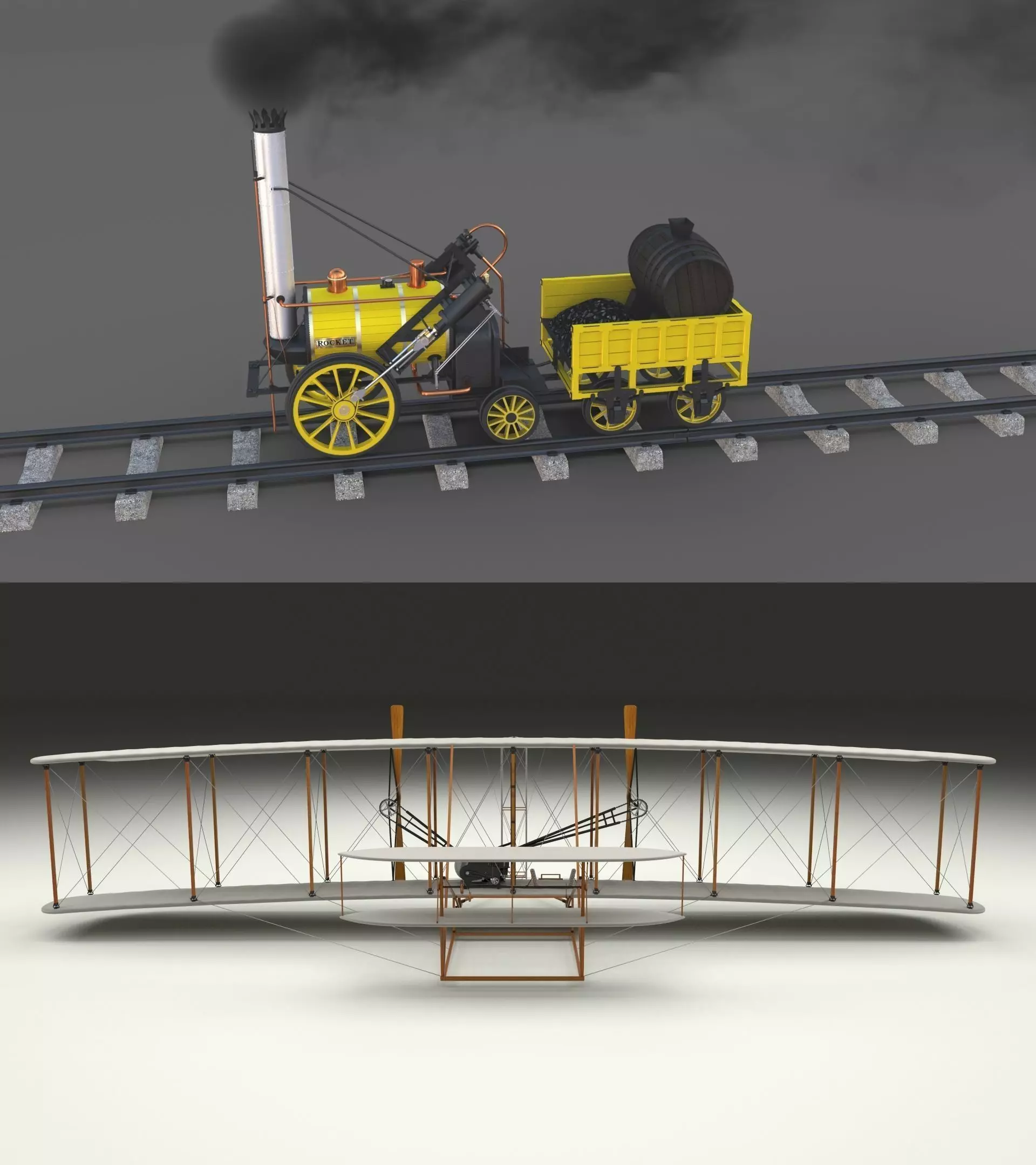 3D model pack consisting of the first succesful airplane, The Wright Flyer and the very first succesful locomotive, The Rocket