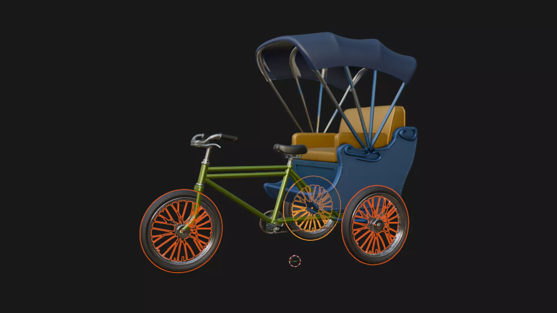 A meticulously crafted 3D model of a classic bicycle rickshaw featuring chrome-trimmed steel frame, plush crimson leather seats, folding scarlet canopy, and polished spoked wheels. Perfect for historical street scenes, Asian city dioramas, or retro transport animations. High-poly detail with clean topology, UV-unwrapped and ready for texturing.