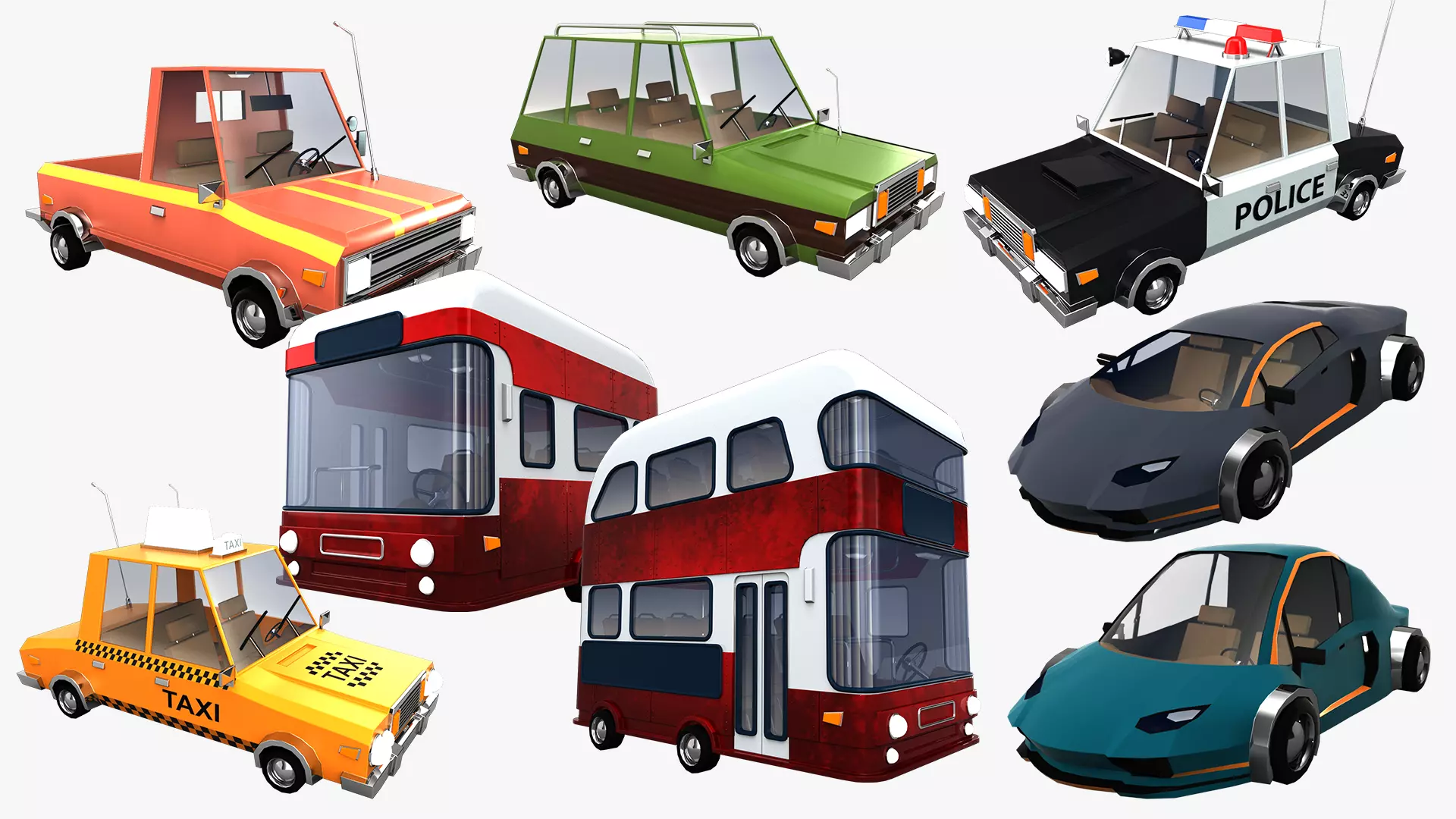 Cartoon Bus and Double-Decker Low Poly Model17,780 Polygons 19,796 Vertices26,030 Polygons 28,996 Vertices