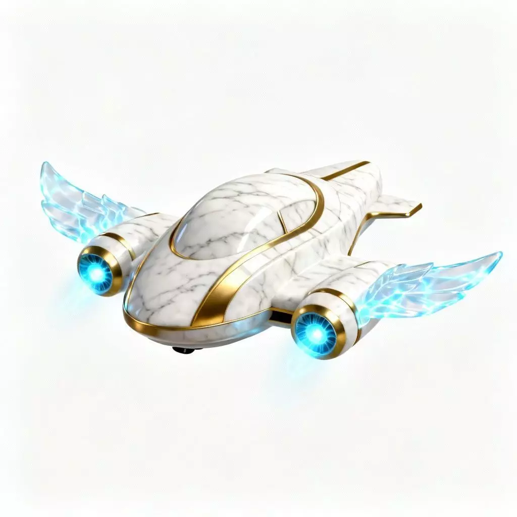 Polished Marble Fuselage The main body is constructed not from metal, but from pristine white marble with subtle grey veining. The stone is smoothed into a seamless, aerodynamic teardrop shape, challenging the viewer's expectation of what a spaceship should be made of.